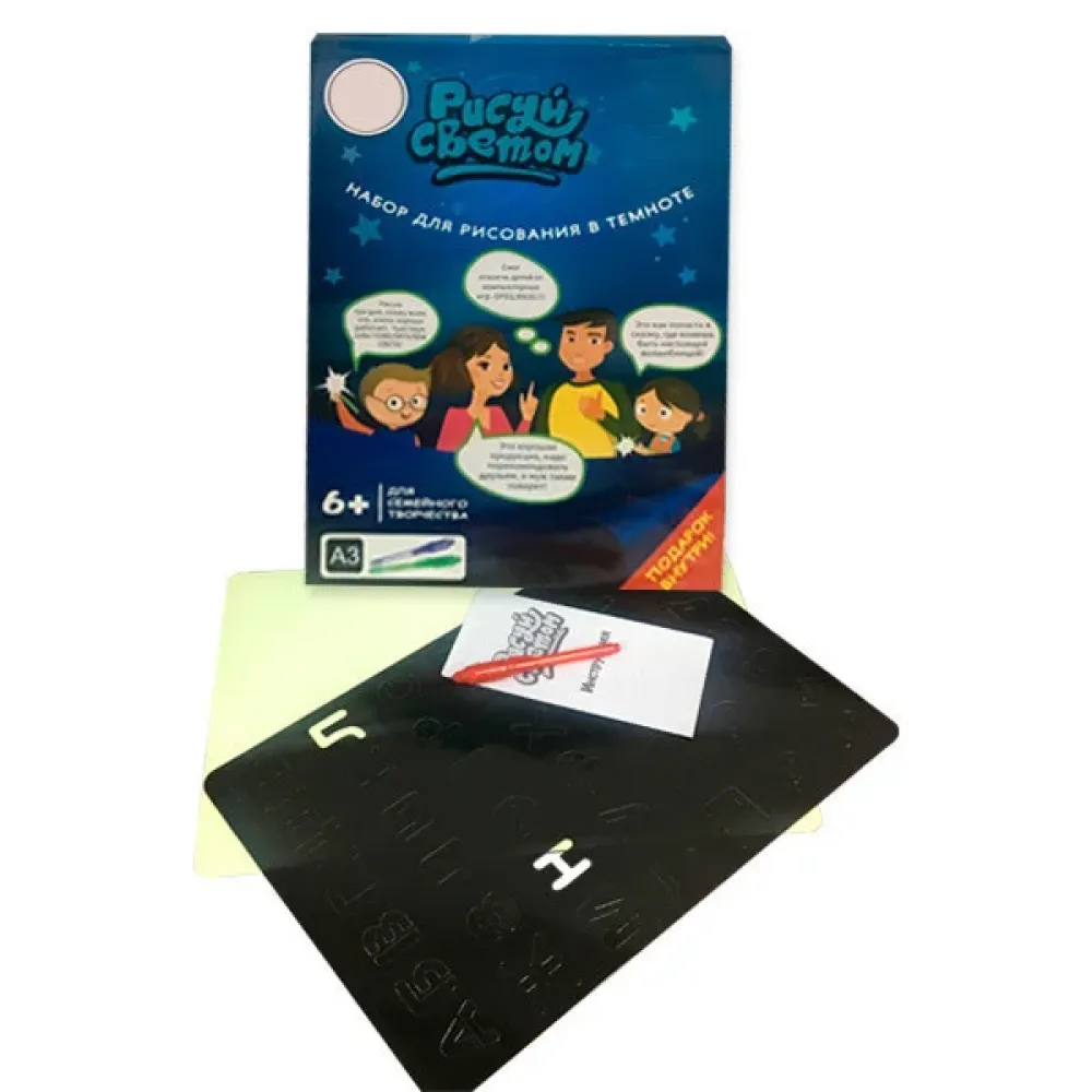 Благодаря данному набору дети почувствуют себя настоящими волшебниками, создавая световые картины. Создавать свои светящиеся в темноте картины дети смогут на специальном планшете формата А4 с помощью ручки, причем рисовать можно, придумывая собственный сюжет или воспользовавшись трафаретами в комплекте. Для рисования не нужно касаться ручкой планшета, нужно включить ее, нажав на кнопку на колпачке и аккуратно водить ею на небольшом расстоянии от планшета.