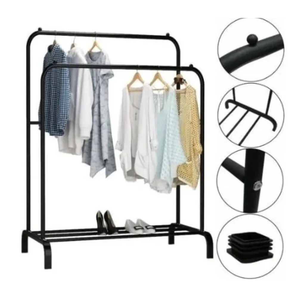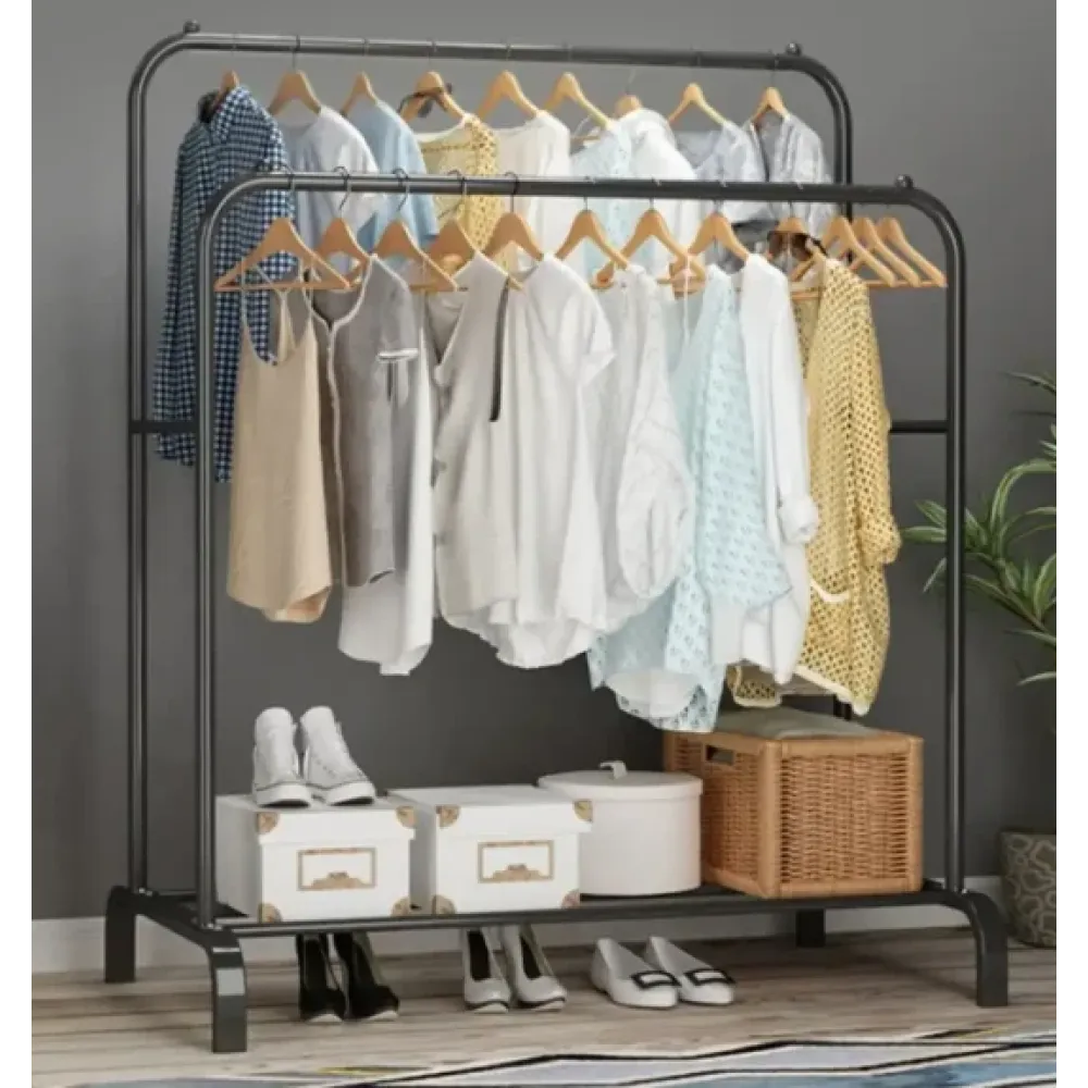 Якщо у вас невелика прихожа, зручна подвійна напольна вешалка для одягу замінить класичний шафа, підходить для речей будь-якої довжини. За допомогою цієї моделі організуйте зберігання плащей, пальто, платтів і іншого одягу, потрібного простору. Додатково для зручності передбачена вмісна полка для зберігання речей у ящиках.