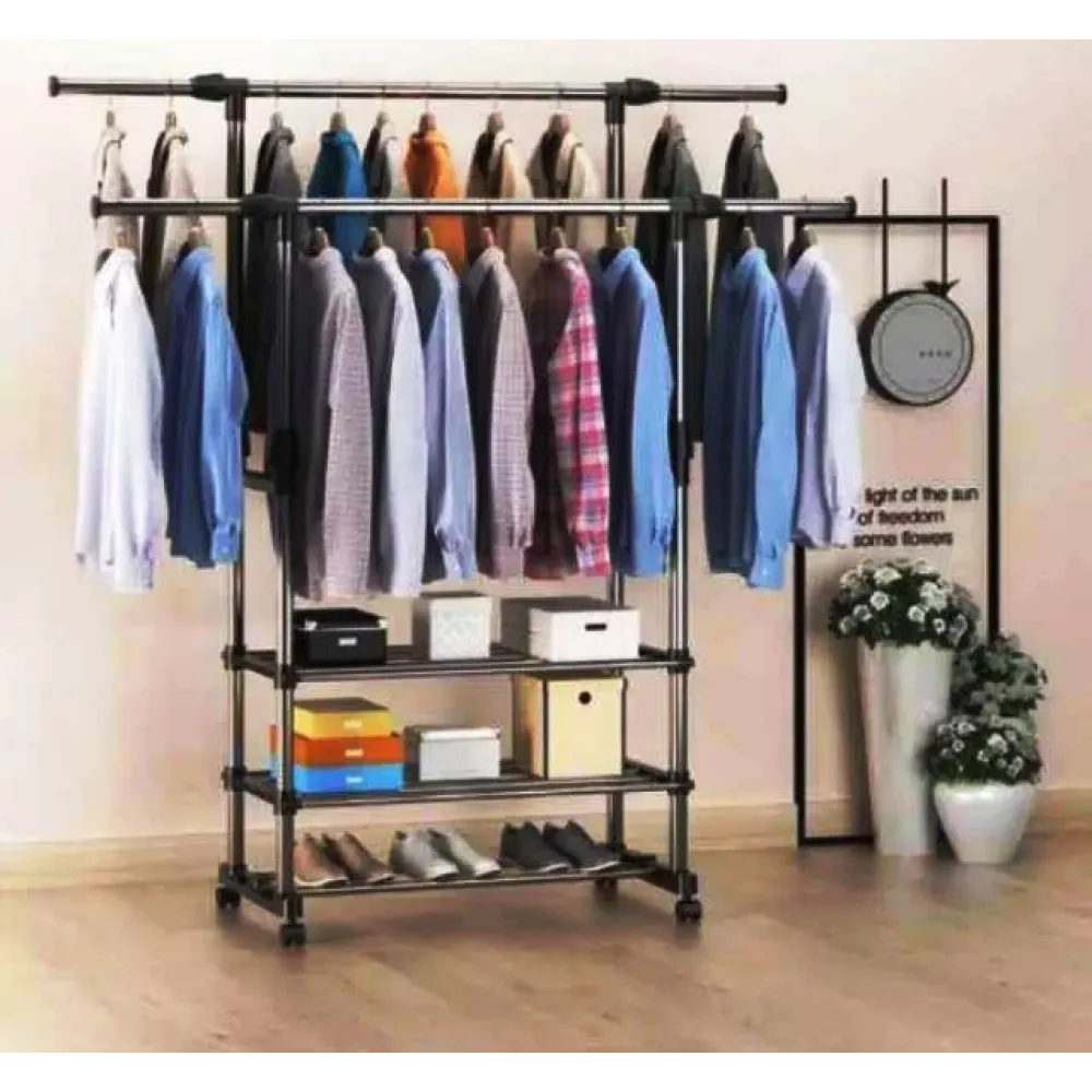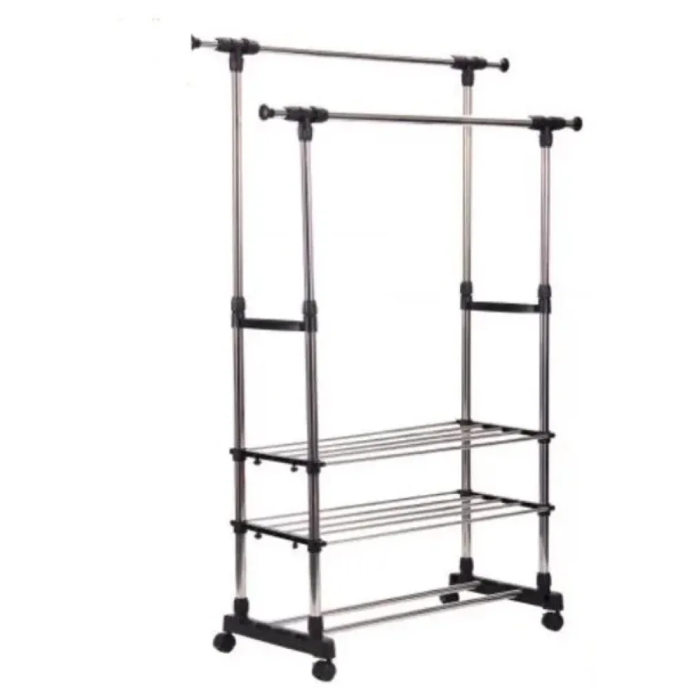 Двойная стойка – вешалка телескопическая на колесиках с полками для одежды и обуви Triple Stand Hanger - это удобный и выгодный способ размещения если не всех то необходимых вещей. Вешалка-стойка двойная телескопическая для одежды Triple Stand Hanger полностью сборная, и ее можно удлинить и сделать выше, либо же сделать уже или ниже.