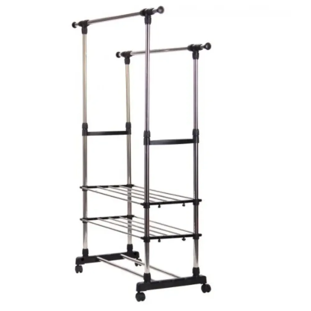 Двойная стойка – вешалка телескопическая на колесиках с полками для одежды и обуви Triple Stand Hanger