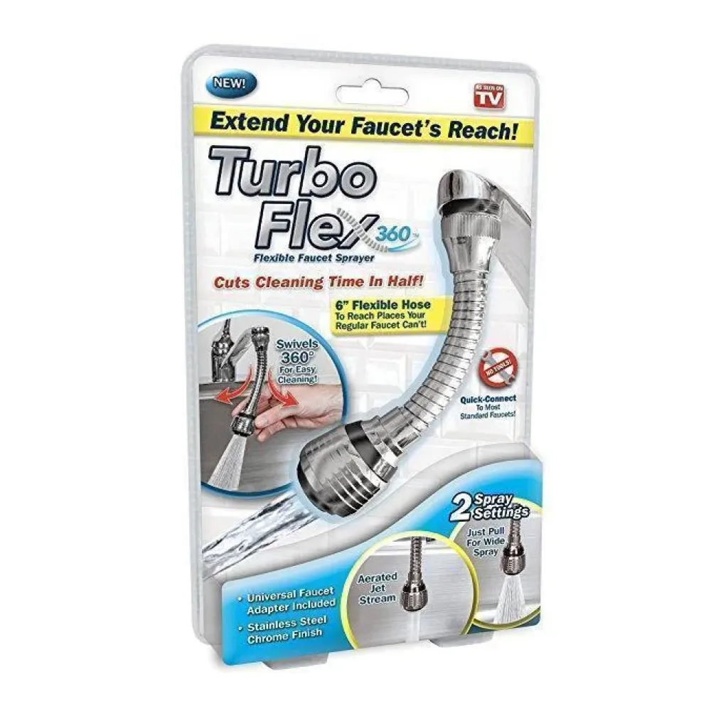 Гибкий шланг аэратор Turbo Flex 360˚ может в считанные секунды преобразовать кран в сильный распылитель с большими возможностями. С ним более удобно ополаскивать фрукты и овощи, наполнять высокие бутылки и вазы, мыть посуду. Эта эластичная насадка завоевала доверие у многих потребителей чем вызвала такую высокую популярность.