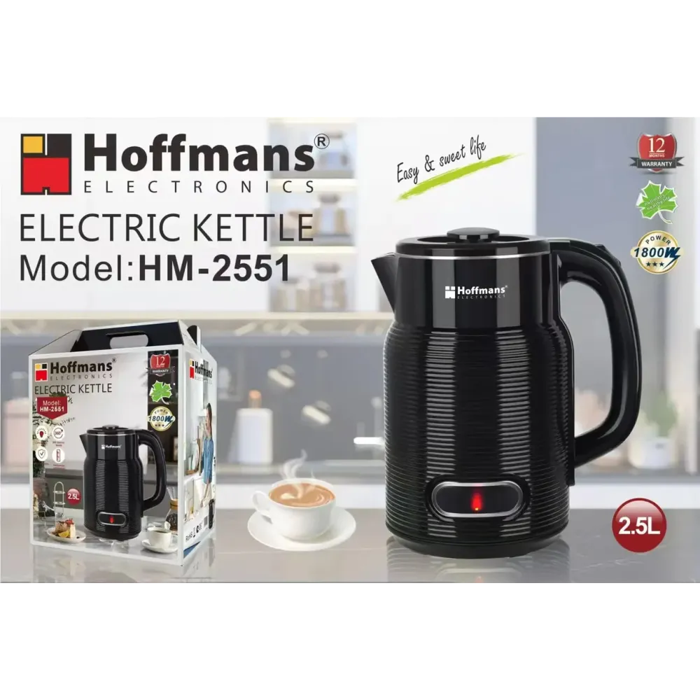 Hoffmans HM-2551 — это современный электрочайник из нержавеющей стали, который сочетает высокую производительность, долговечность и стильный дизайн. Благодаря объёму 2,5 литра он идеально подходит для семьи, офиса или небольшой встречи с гостями, позволяя быстро вскипятить достаточное количество воды для чая, кофе, горячего шоколада или других напитков.