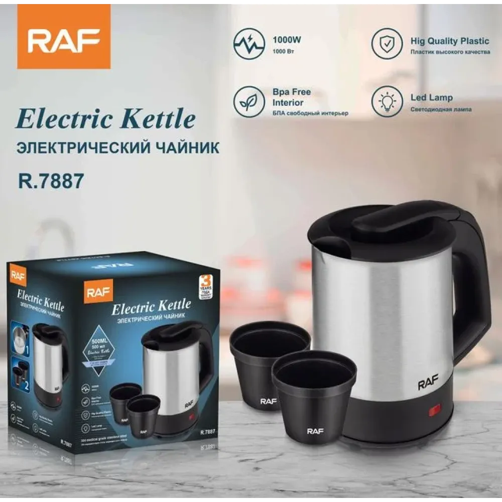 Чайник электрический дорожный RAF R.7887, 0.5 л + две чашки в комплекте