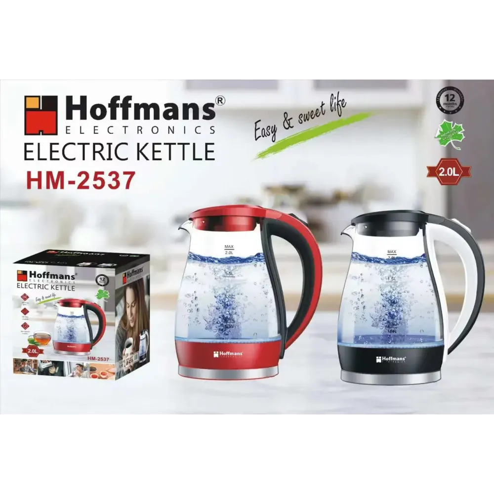 Hoffmans HM-2537 — стеклянный электрочайник с дисковым нагревом, созданный для быстрого и безопасного кипячения воды. Объём 2 литра позволяет одновременно приготовить несколько порций чая или кофе.