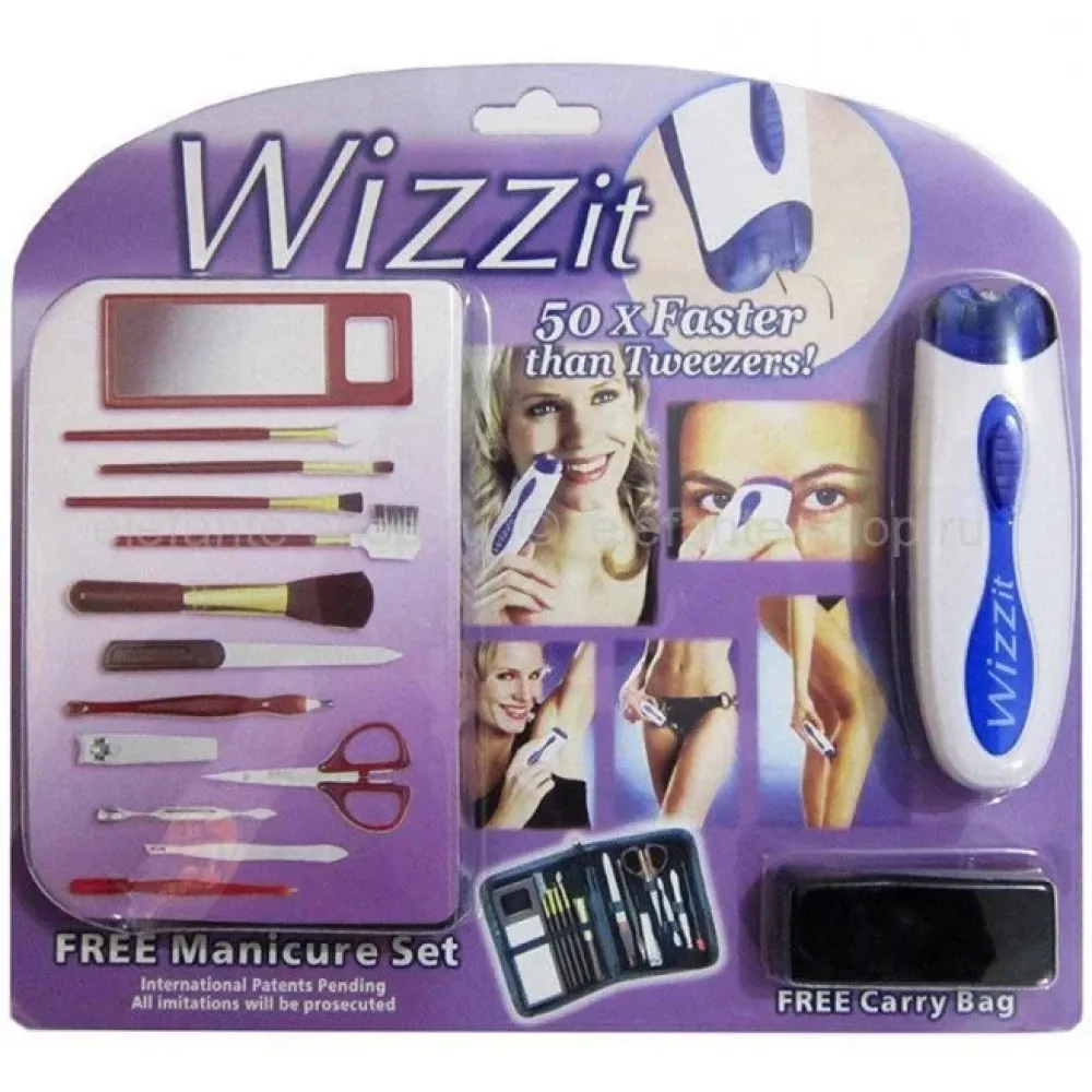 При помощи домашнего помощника Wizzit (Визит) можно удалить волосы не только на ногах и руках, но и в области лица, подмышек, откорректировать форму бровей, и что немаловажно – избавиться от нежелательных волосков в зоне бикини! Плюс ко всему этому – в комплекте набор для маникюра и дорожный чехол для этих аксессуаров!