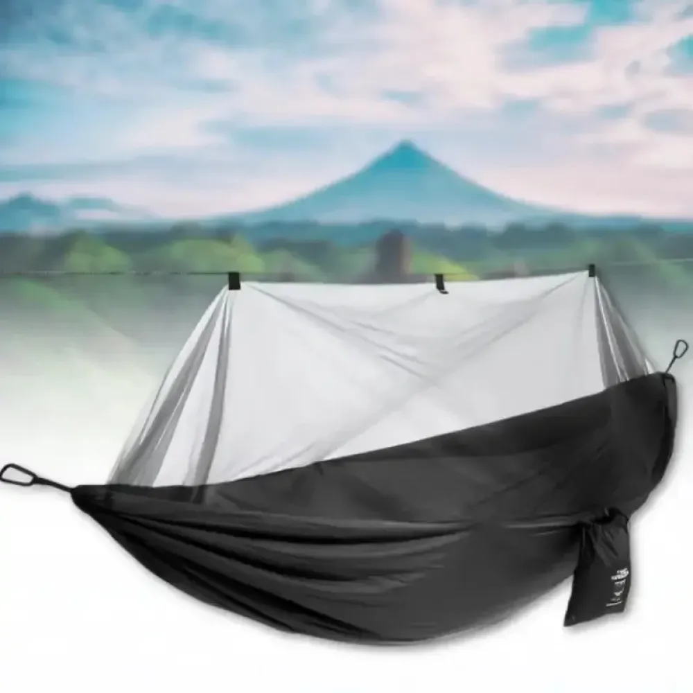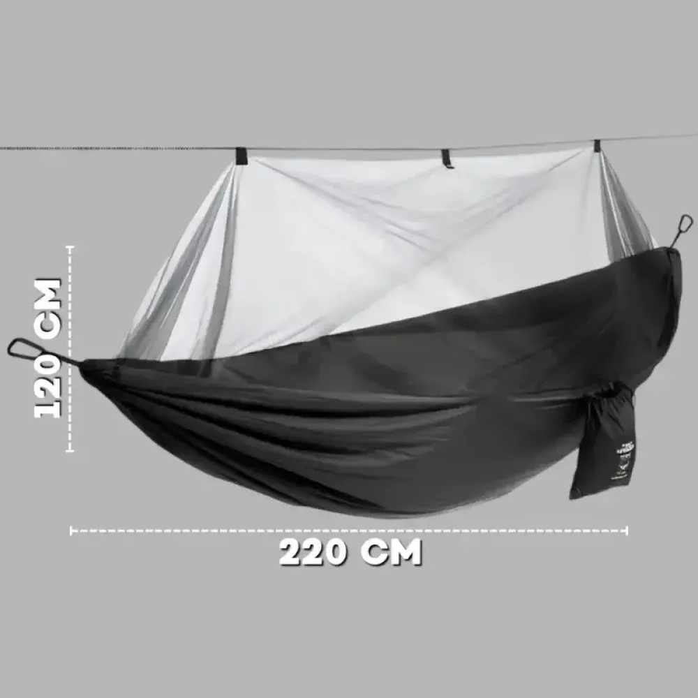 Гамак имеет прочную встроенную москитную сетку, которая закрывается на молнию и полностью изолирует вас от надоедливых комаров и мошек. Материал нейлон парашютного типа выдерживает нагрузку до 200 кг, отлично вентилируется и быстро сохнет. Усиленные швы и надёжные карабины обеспечивают долговечность и безопасность.