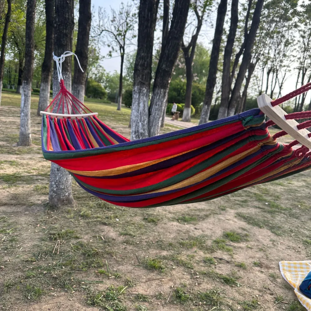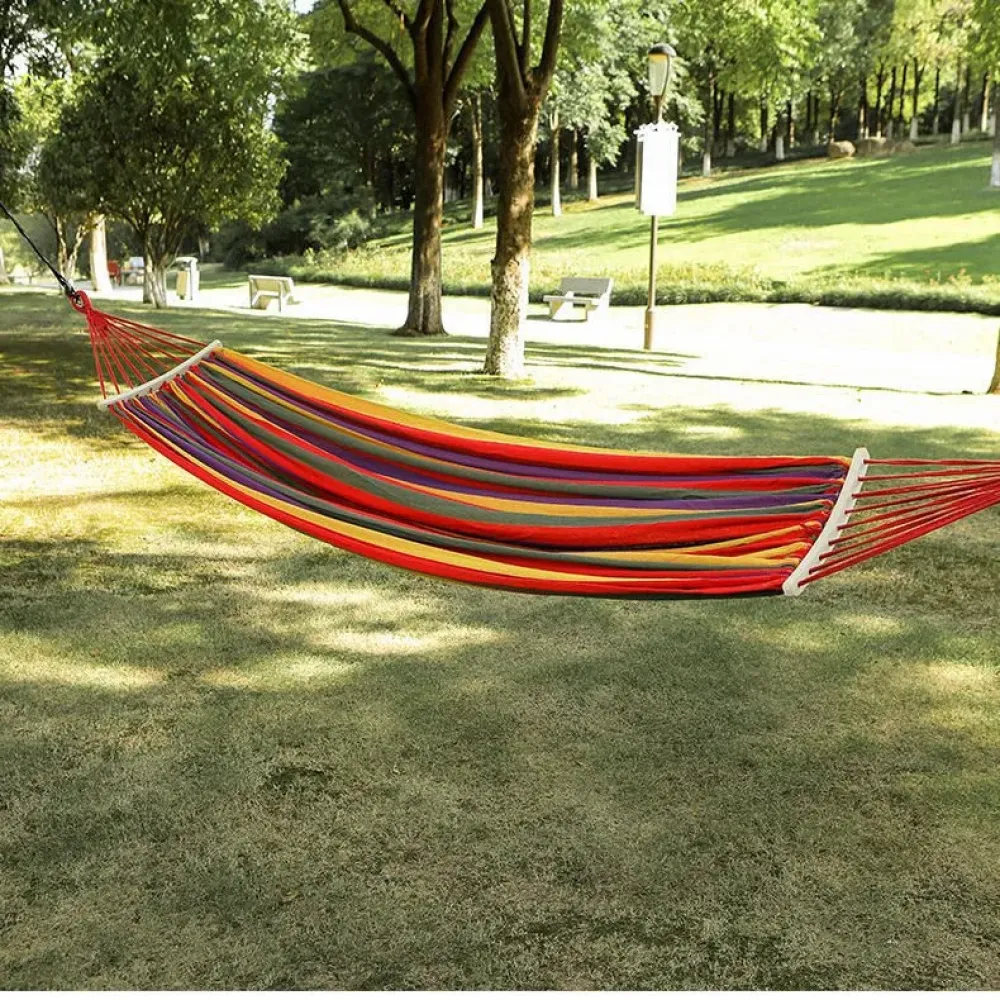 Классический тканный гамак - простой и надежный вариант расслабиться. Нужно всего лишь найти два дерева, недалеко стоящих друг от друга, повесить гамак, занять горизонтальное положение и почувствовать абсолютную надёжность и невесомость. В гамаке предусмотрены специальные кольца для подвешивания гамака на деревья. Ещё можно использовать две веревки, которые продевают в кольца и обматывают несколько раз вокруг дерева и завязывают на несколько узлов.