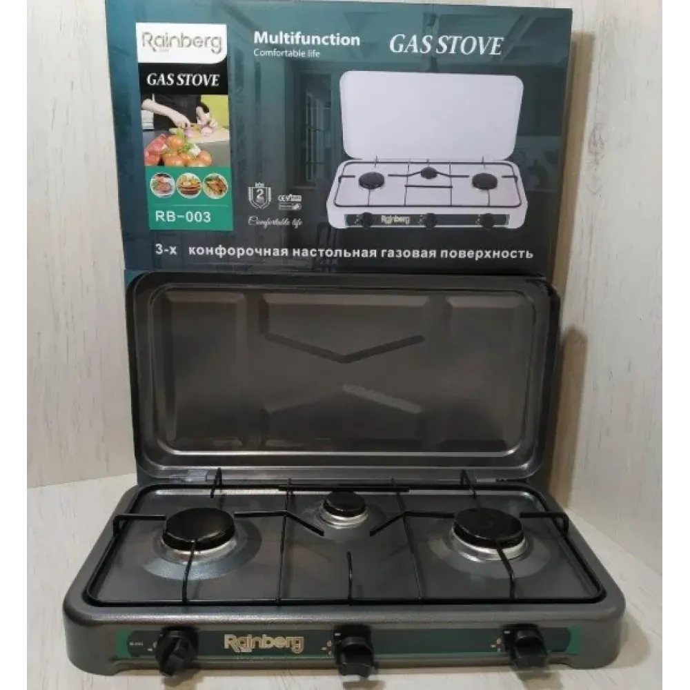 | Газовая плита Rainberg RB-003 на три конфорки ∙ Трехконфорочная настольная плитка – таганок с крышкой |