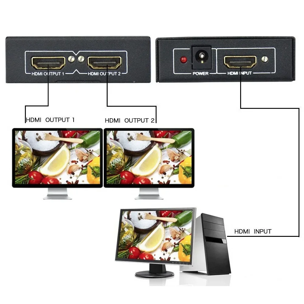 HDMI Сплиттер – разветвитель видеосигнала телевизионный коммутатор HDMI сигнала 4K 1x2 порта 3D Splitter 1080p используется для одновременного распределения изображения на 2 монитора.
