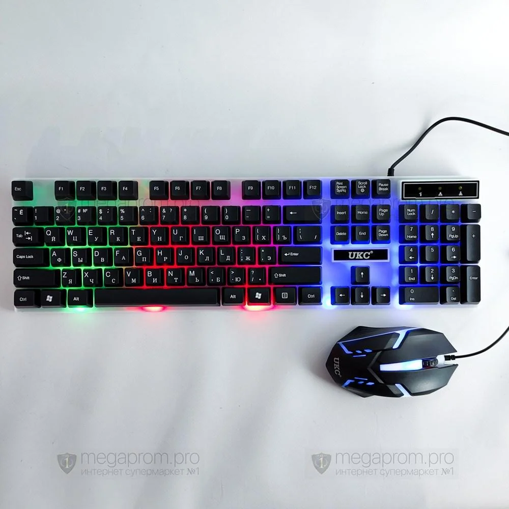 Профессиональная игровая клавиатура K01 создана для геймеров. Ее колпачки и кнопки сделаны из специальных материалов, которые обеспечат стабильность и хорошее качество даже при частом использовании. Имеет светодиодную подсветку, которая позволяет видеть клавиатуру ночью. Мышь достаточно точна, приспосабливается к движениям рук и разрешению монитора, что важно для лучшего контроля над играми. Имеет красочный футуристический минималистичный дизайн. Яркий гейминговый набор для уверенной победы UKC , состоит из мембранной клавиатуры с подсветкой и оптической мыши. Создай свое уникальное рабочее место для игры. Наслаждайся каждым моментом игры. Проводная клавиатура с мембранными клавишами, 104 штуки, усиленные переключатели рассчитаны на 10 млн. нажатий. Устройство оснащено мягкими игровыми клавишами, которые более комфортны по сравнению с обычными. С каждым нажатием вы получаете тактильный отклик, что позволяет обрести уверенность в срабатывании независимо от того, в какую игру вы играете. Отличная проводная клавиатура классического типа со стандартным набором и компоновкой клавиш, может использоваться как в домашних условиях, так и в офисе. Корпус изготовлен из качественного пластика черного цвета. Ее кнопки сделаны из специальных материалов, которые обеспечат стабильность и хорошее качество даже при частом использовании. Реализована технология Anti-Ghosting, обеспечивающая несколько одновременных нажатий клавиш. Оптическая проводная мыши, с точным сенсором. Играй и побеждай, мышка удобно ложится в руку, выполнена из матового пластика, не скользит в руке. Подходит под любой вид хвата, на боковых панелях вставки для более удобного захвата ладонью. Подсветка мыши идеально сочетается с подсветкой клавиатуры. Создай игровое пространство вокруг себя.