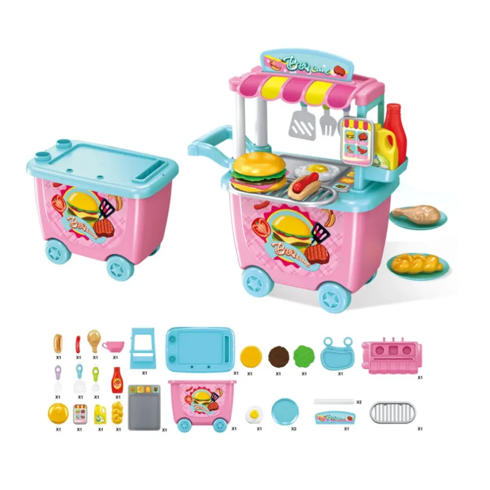 Набор Закусочная включает яйца, сосиски, гамбургеры, овощи, гамбургеры, вилки, бутылки для соусов и другие аксессуары