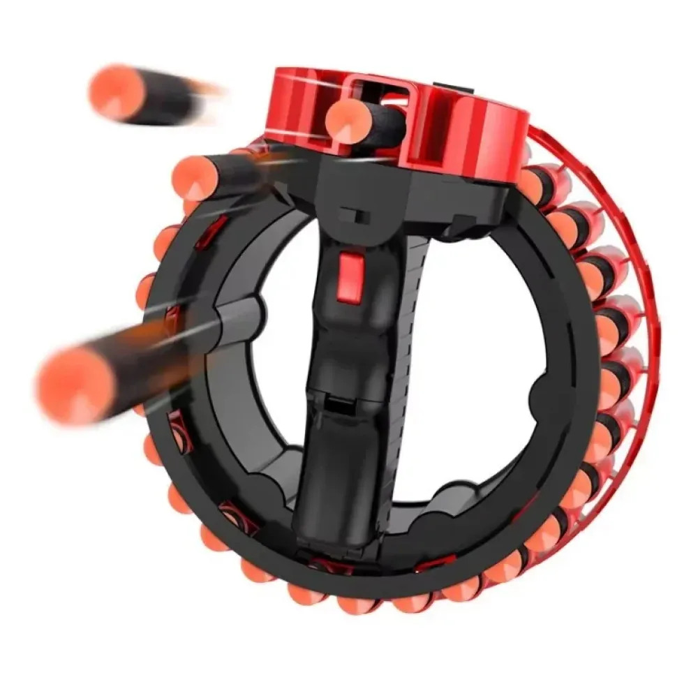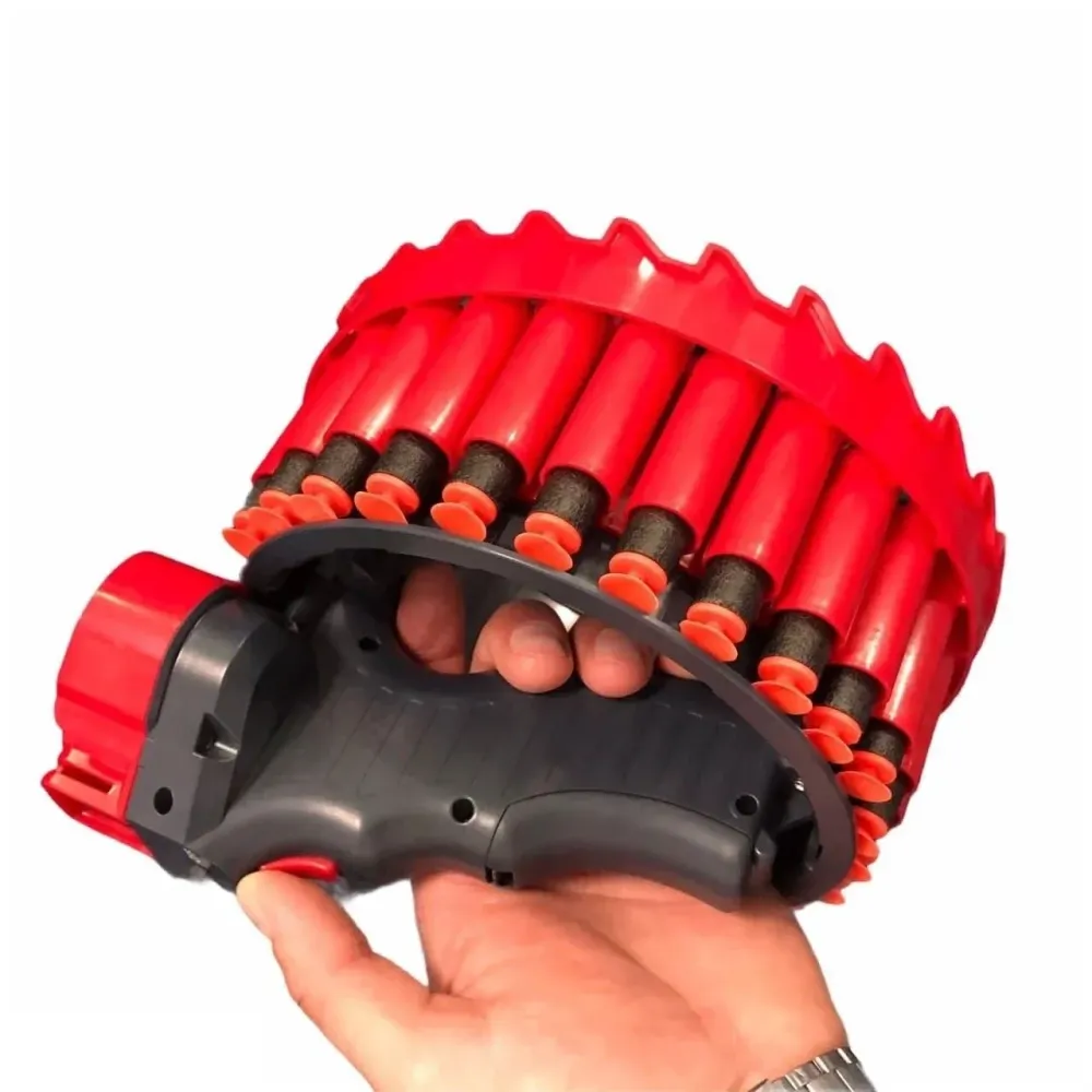 Бластер пулемет представлен в виде рукоятки с патронным барабаном. На рукояти находится 2 кнопки управления: ВКЛ И ВЫКЛ для запуска стрельбы, поэтому пользоваться оружием очень просто. Для начала необходимо вставить до упора (!) 28 патронов в ячейки барабана, включить бластер, снять предохранитель, прицелиться и нажать кнопку пуска!