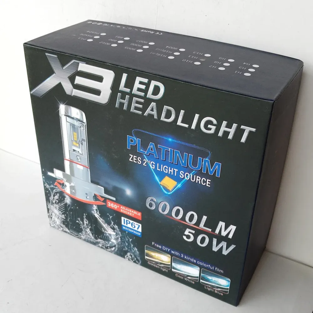 LED лампы X3 H1 6000L 2x25W ZES Тип X3 Кол-во светодиодов: 6 шт в каждой лампе. Тип светодиода: Philips LUXEON ZES Световой поток комплекта: 6000 Лм Напряжение питания: 9~24 В Входной ток: 2.0A±0.2A Потребляемая мощность ламп: 2x25 Ват Цветовая температура: 6000K Нет вентилятора Материал: авиационный алюминий Степень влагозащищенности: IP67 Срок службы более 30000 часов Рабочая температура -40° ~ +80°