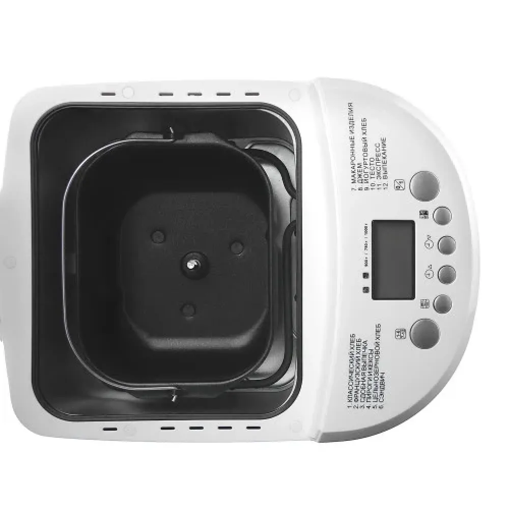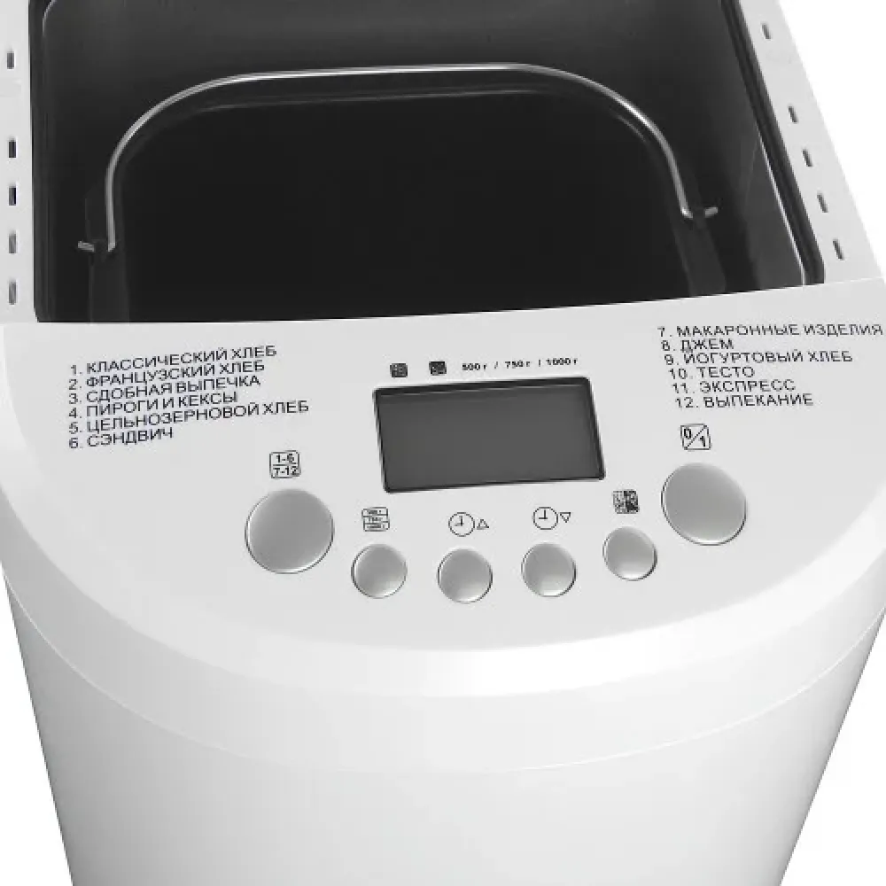 Хлебопечь мощностью 580 Вт, выход готового продукта – 1 кг, 0,75 и 0,5 кг (можно выбрать). 12 программ приготовления, в том числе ускоренная выпечка.