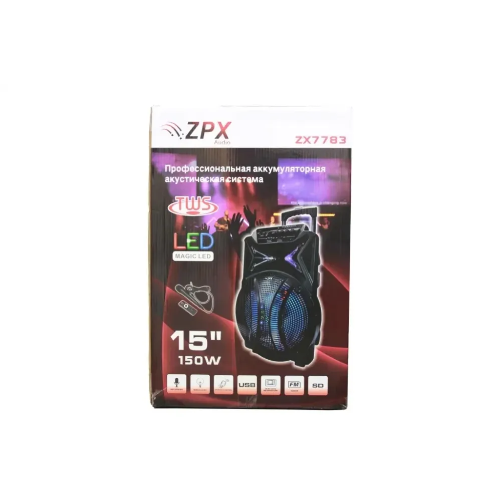 Колонка аккумуляторная 15 дюймов Акустика музыкальная с микрофоном мобильная на колесиках ZPX-7783 150W идеально подходит для пикников, школьных торжеств, конференций, публичных выступлений, митингов, выставок, рекламных акций и многих других местах где нужно провести ваше мероприятие с сильным и качественным звуком емким аккумулятором 2,2Ah 7.4v