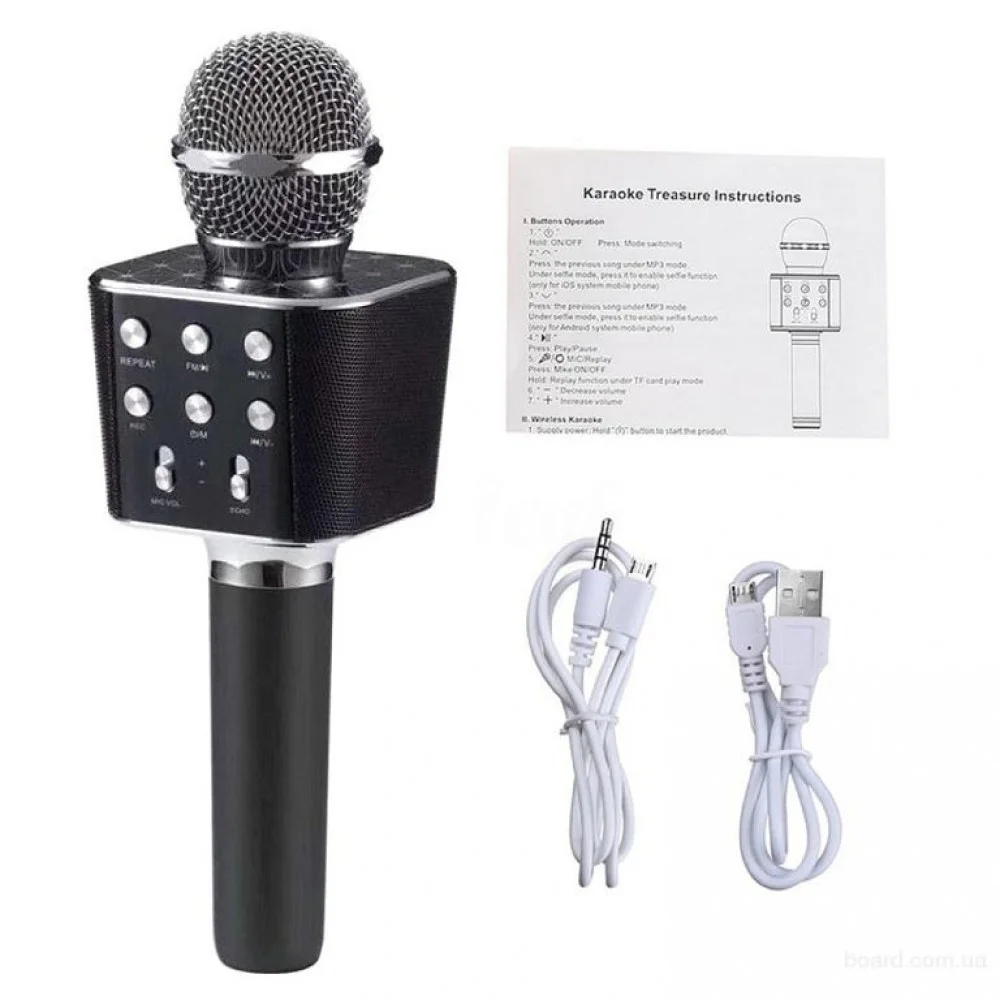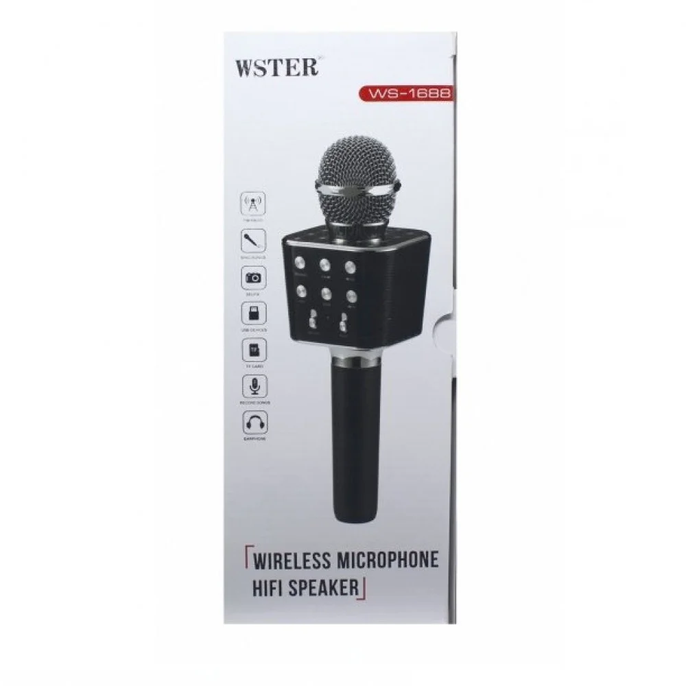 Оригинальный беспроводной караоке микрофон - колонка 2 в 1 Wster WS-1688 - это оригинальное устройство объединившее в себе вокальный Bluetooth микрофон и универсальную стерео колонку. Мобильный караоке-микрофон WSTER WS-1688 может стать отличным инструментом для начинающих вокалистов или средством скрасить приятный вечер в компании друзей. Портативный комбо микрофон можно использовать как MP3-плеер, переносную колонку или караоке-микрофон в комбинации со смартфоном или планшетом, и даже как мобильное зарядное устройство в экстренных ситуациях. Модель1688 оснащена беспроводным модулем Bluetooth, слотом USB и microUSB для чтения музыкальных файлов. Внешне микрофон WS-1688 напоминает популярную модель WS-858, но отличается другой формой и большими размерами аудио модуля, обладая теми же характеристиками, функционалом и отличным качеством звучания.