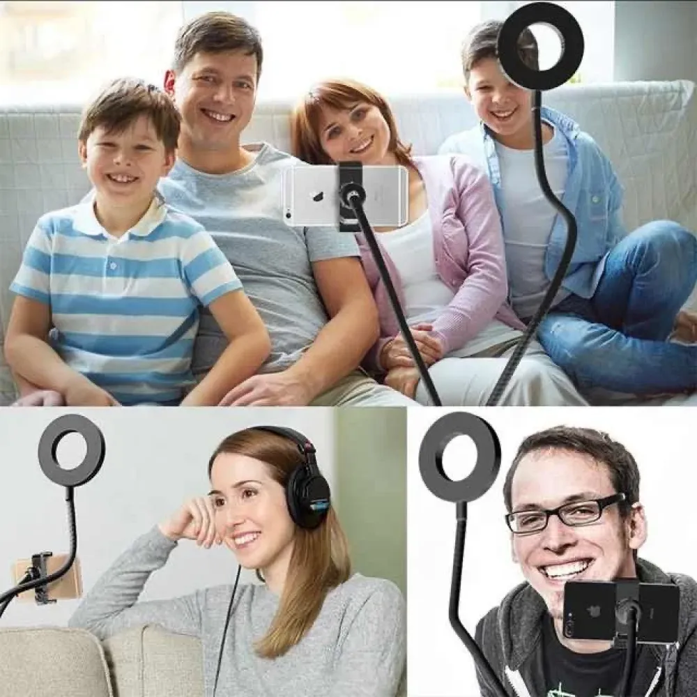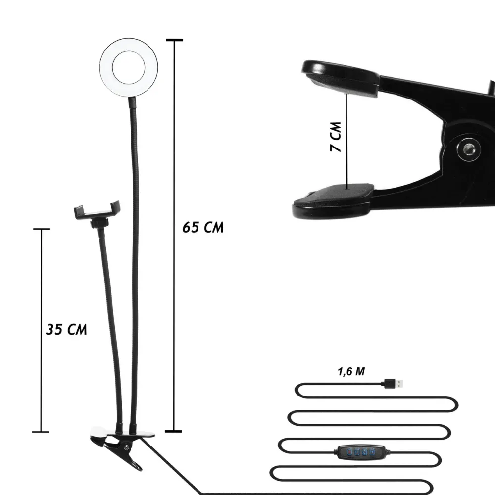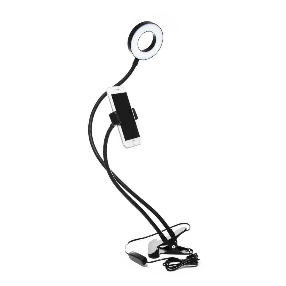 Конструкция кольцевой лампы надежно крепится к горизонтальной поверхности стола. На основном гибком плече крепится регулируемый светильник с LED светодиодами, Второе гибкое крепление предназначено для мобильных гаджетов, с различным размерами корпуса (до 6,5”). Питание осуществляется при помощи подключения по USB 5V.