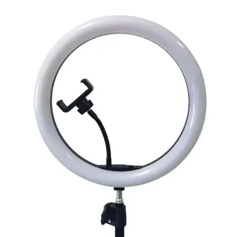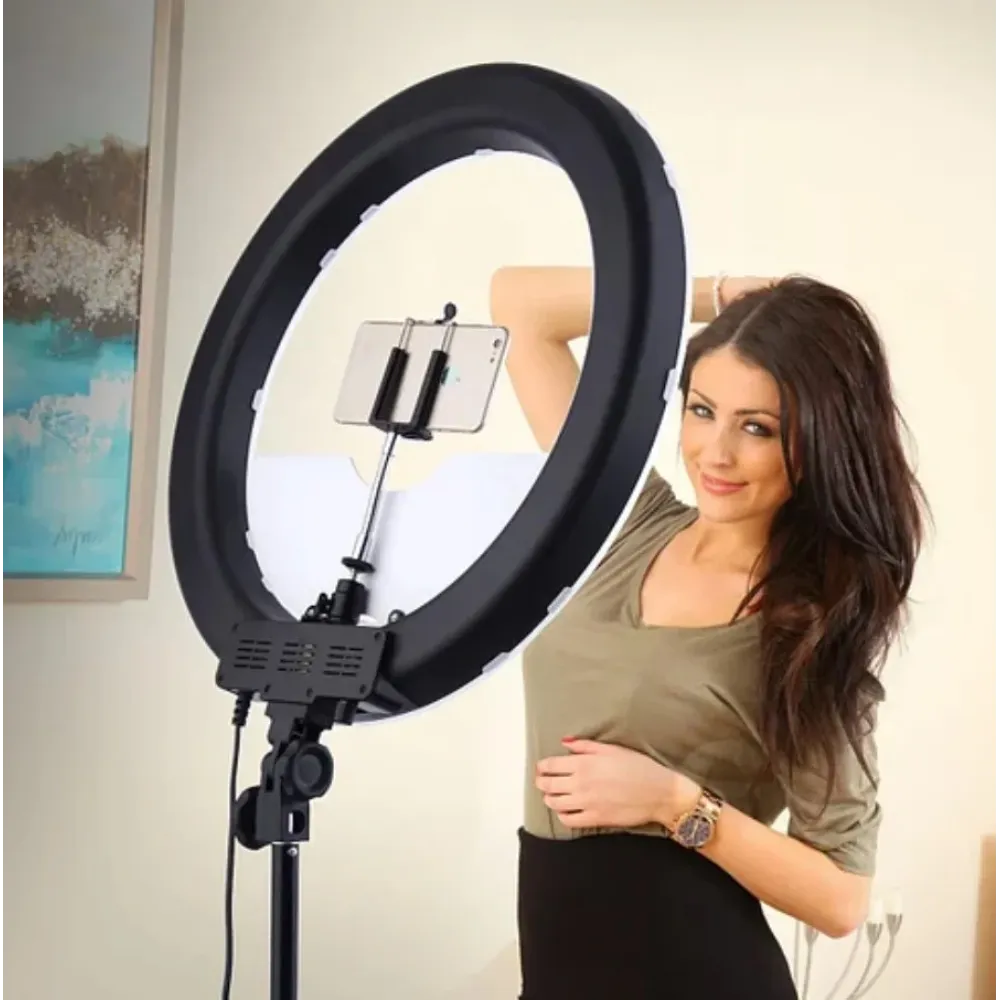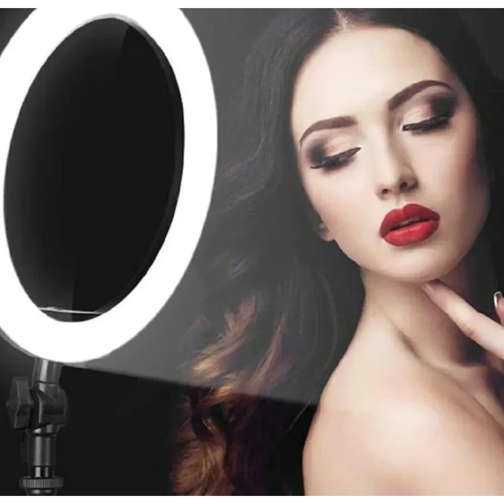 Кольцевая светодиодная лампа выполнена в виде алюминиевого кольца со штативом и держателем для телефона, пользуется популярностью среди визажистов, дизайнеров, фотографов. Такому широкому спектру применения лампа кольцо обязана своему дизайну, благодаря которому получается рассеянный и мягкий свет.