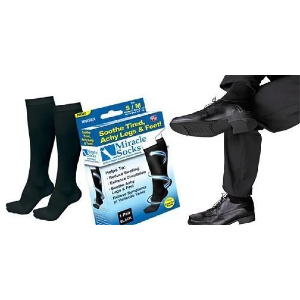 Miracle Socks успокаивают, массируют, тонизируют усталые ноги. Они значительно улучшают состояние ваших ног без медицинского вмешательства и приёма дорогих лекарств. Их можно носить с любой обувью. Тонкие и эластичные компрессионные носки облегают ногу так же, как и обычные носки. Носите вашу любимую обувь и заботьтесь о здоровье ног — одновременно! Miracle Socks — это очень комфортная деталь ухода за своими ногами!
