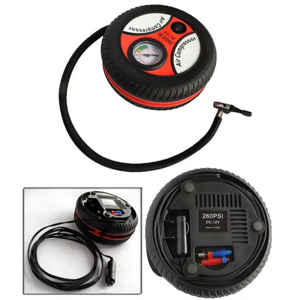 Компрессор автомобильный портативный Мини КОЛЕСО Air Pump 250 psi · Воздушный компрессор для шин электрический · Авто-насос для подкачки колес с манометром и набором иголок Air Compressor 12V выполнен из прочного материала в виде колеса или шины. Насос для автомобилей легкий и не большой. Поэтому его просто перевозить и хранить в машине.