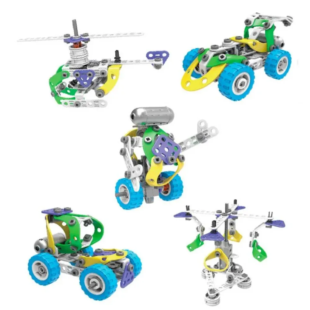 Конструктор детский Build&Play 5 в 1 С мотором 109 эл. J-7783 позволяет собрать 5 различных моделей транспортных средств (инструкция в комплекте). Механизм приводит в движение небольшой моторчик, который идет в комплекте.