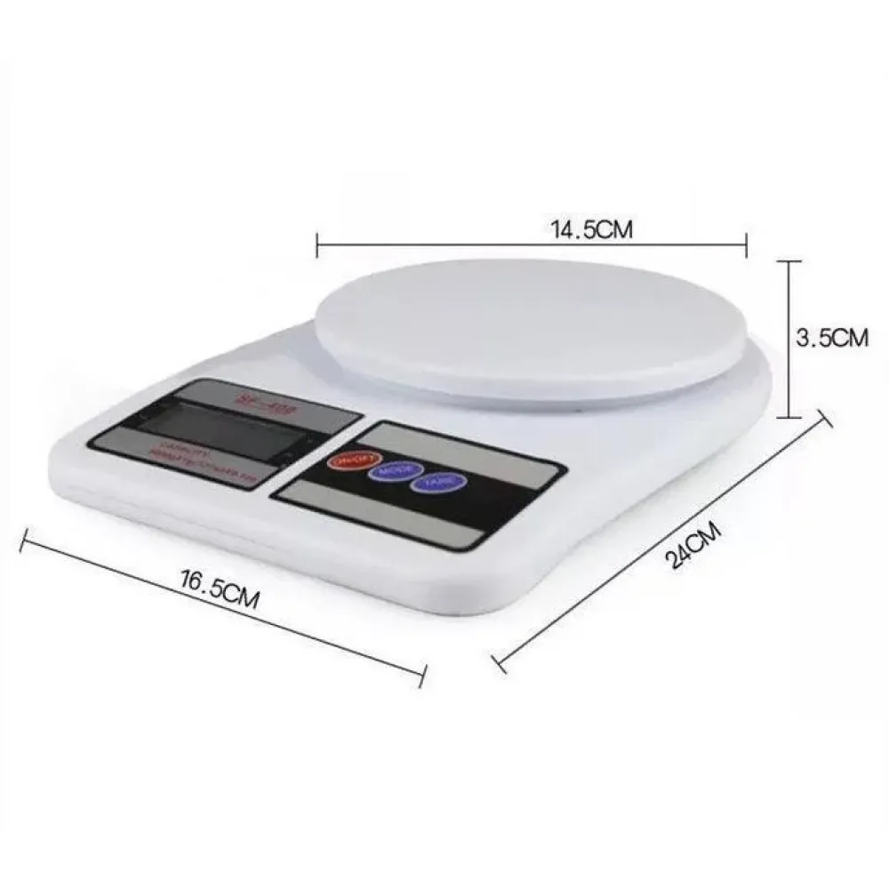 Прибор выполнен в белом корпусе. Предел взвешивания: 10 кг. Весы Electronic Kitchen Scale SF-400 (Электроник Китчен Скейл) станут незаменимым помощником на кухне, если Вы готовите блюда либо выпечку, требующие максимально точного количества продуктов.