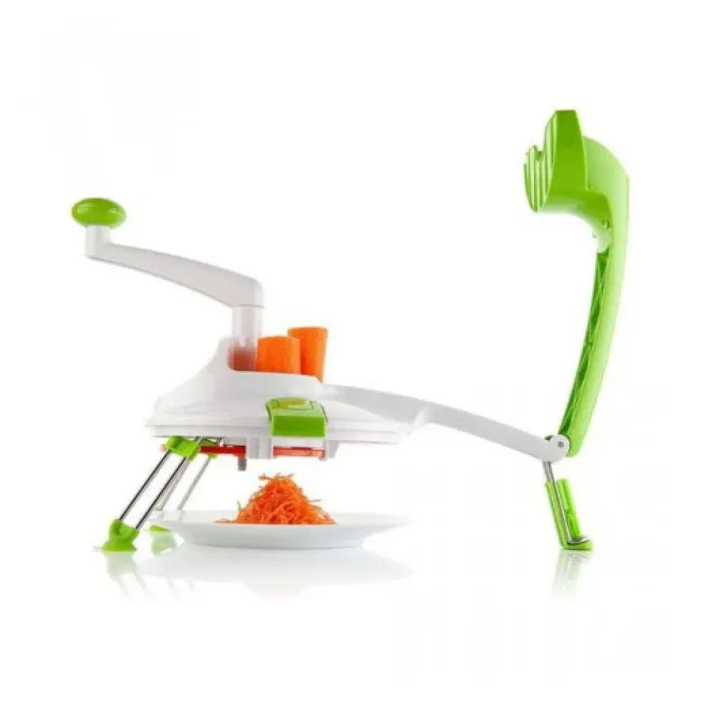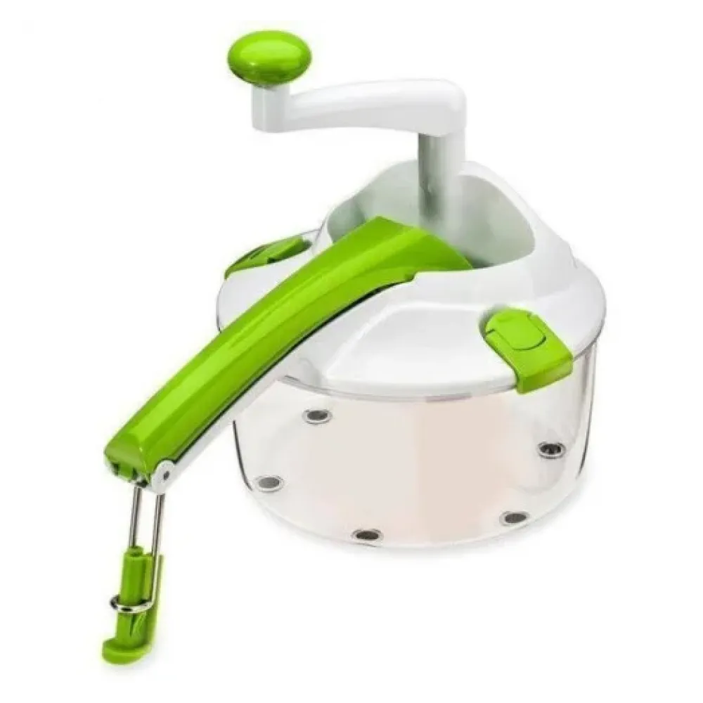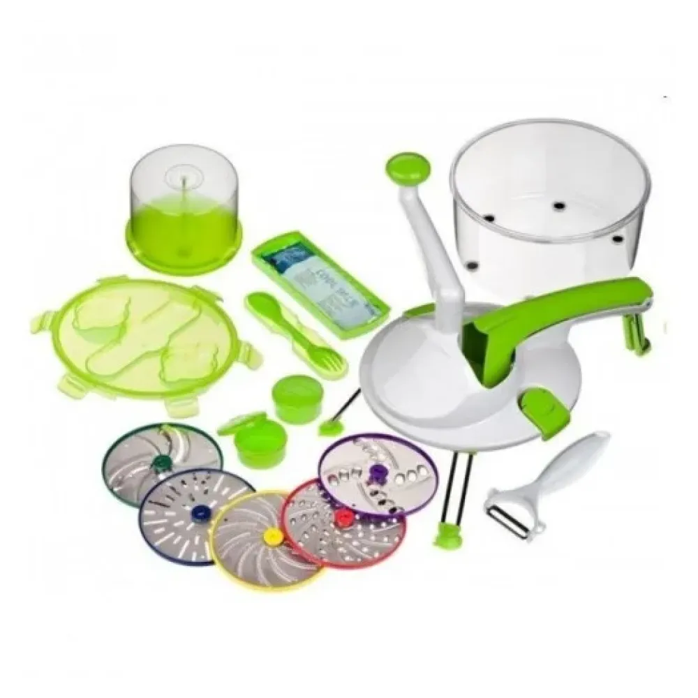 Roto Champ - это очень уникальная овощерезка со сменными насадками в виде дисков, которые приводятся в движение при помощи ручного привода и Вы сможете самостоятельно регулировать скорость вращения ножей для приготовления любого блюда. Роторная терка Рото Чамп способна измельчать мягкие и твердые продукты при помощи 4 сменных насадок с ножами, которые помогут нарезать продукты кубиками, кольцами и соломкой разного диаметра. Возможно нарезание на доску или в пластиковый контейнер емкостью 2.4 литра.