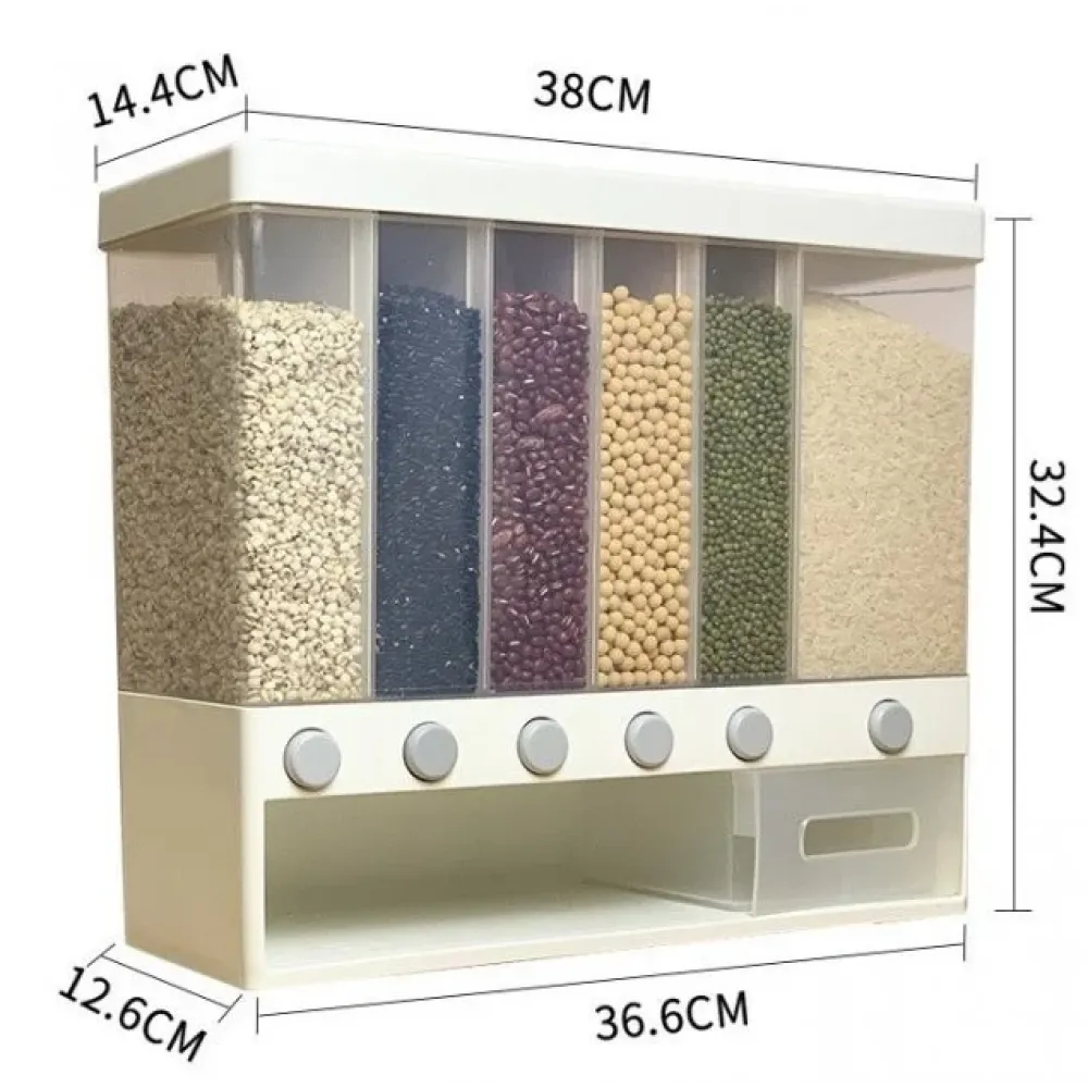 Кухонный органайзер для сухих сыпучих продуктов, предназначен для хранения продуктов, в нем имеется шесть отсеков, которые разделены съемными перегородками для предотвращения смешивания продуктов. Перегородки можно снять для увеличения объема того или иного отсека. Таким образом, увеличивается объем отсека для любимых продуктов, а оставшиеся небольшие отсеки используются для хранения реже используемых зерен.