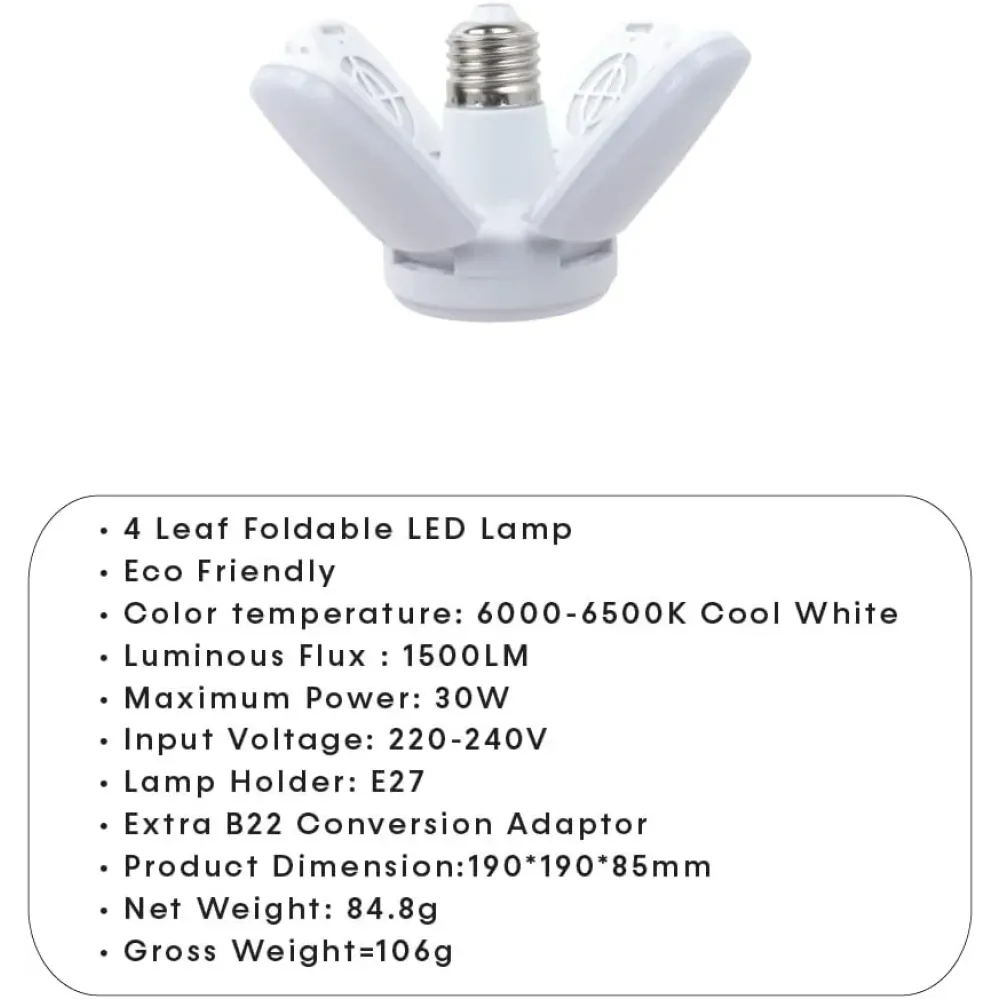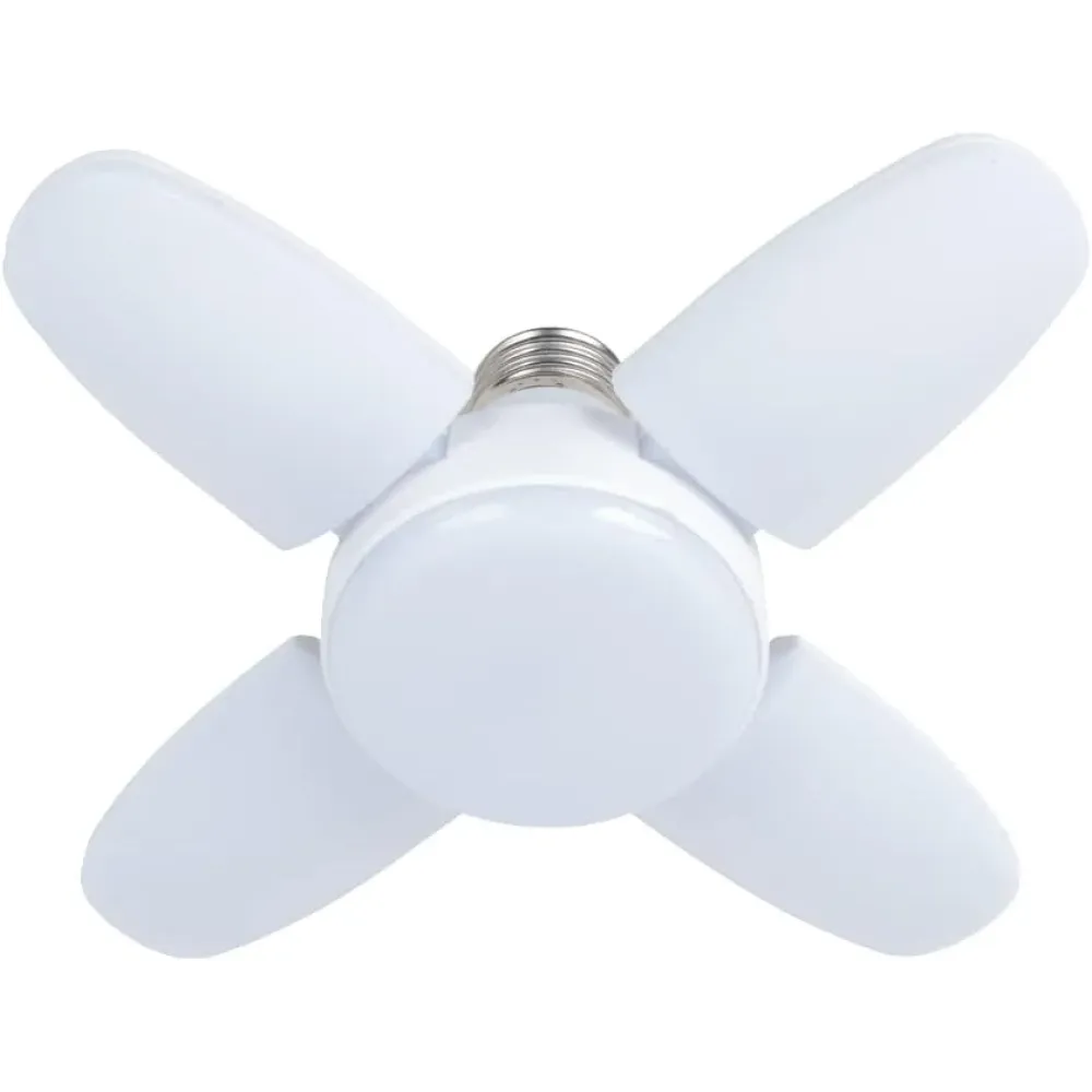 Складная конструкция с 4 лопастями позволяет регулировать угол освещения под индивидуальные нужды — от направленного до панорамного света (180°–360°). Лампа легко устанавливается в стандартный патрон E27, что делает её универсальной и удобной в использовании.