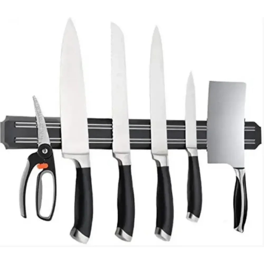 Изделие изготовлено из высококачественной нержавеющей стали, магнита и прочного пластика (полистирола). Держатель для ножей идеально впишется в интерьер современной кухни и позволит полнее использовать пространство, избегая размещения ножей на горизонтальной поверхности.