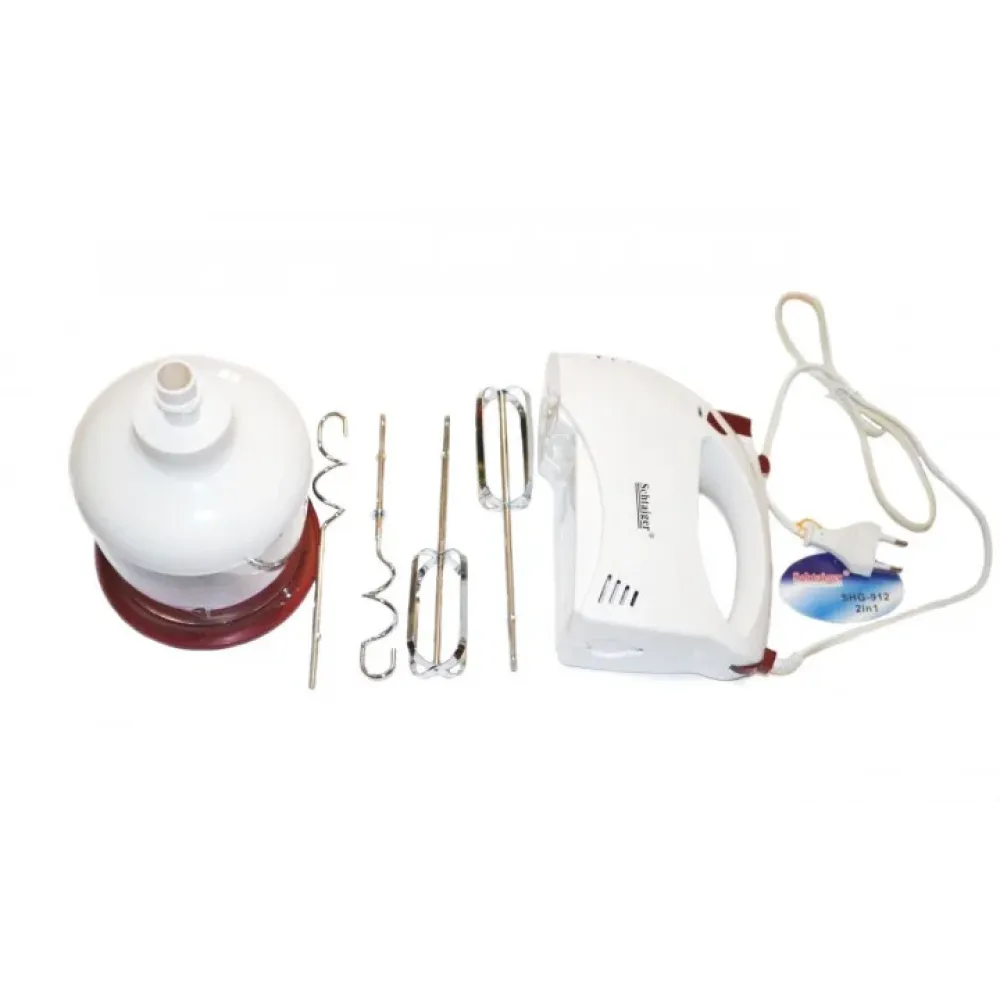 Блендер миксер Schtаiger SHG-912 может похвастаться пятью скоростями работы и турбо режимом включительно. Венчики: приготовление соусов,кремов, майонеза, бездрожжевого теста легкой консистенции, взбивание белков ияиц. Блендер : приготовление супов-пюре, коктейлей, детского питания, майонеза, соусов, измельчение вареныховощей и фруктов. Измельчитель: измельчение вареных и свежих овощей и фруктов, измельчение мяса. Неоспоримым плюсом при использовании данной модели можно назвать простоту ухода за прибором, все комплектующие, кроме моторного отсека, можно мыть в посудомоечной машине.