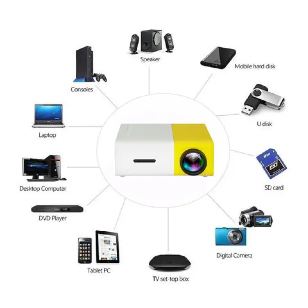 YG-300 — портативный проектор с поддержкой Wi-Fi сети. К проектору можно подключить компьютер, планшет, телефон или приставку с помощью Hdmi или AV кабеля. За счет наличия разъемов он может воспроизводить видео с сети, USB-накопителя, диска или micro-SD карты. В проекторе есть встроенный динамик, мощностью 1 Вт. Несмотря на то, что разрешение матрицы проектора 320 на 240, он поддерживает воспроизведение видео до FullHD.