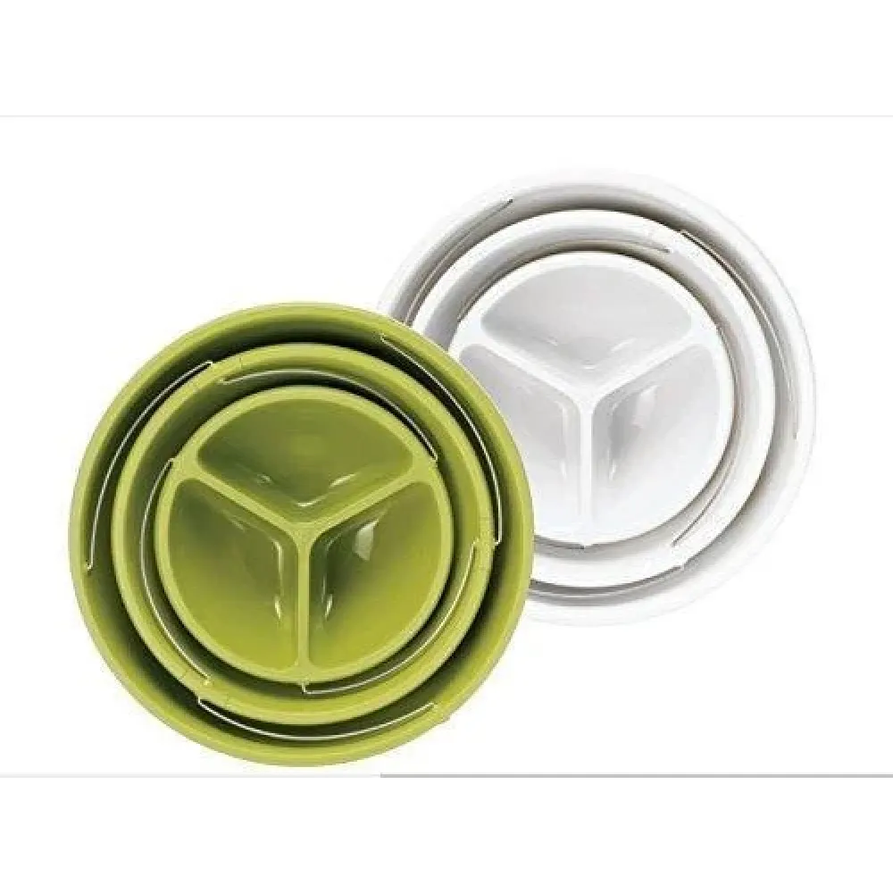 Миска с 3 уровнями отличается уникальным дизайном, которая открывается простым поворотом и складывается для удобного хранения. Кроме того, верхний лоток предлагает 3 отсека для небольших закусок.