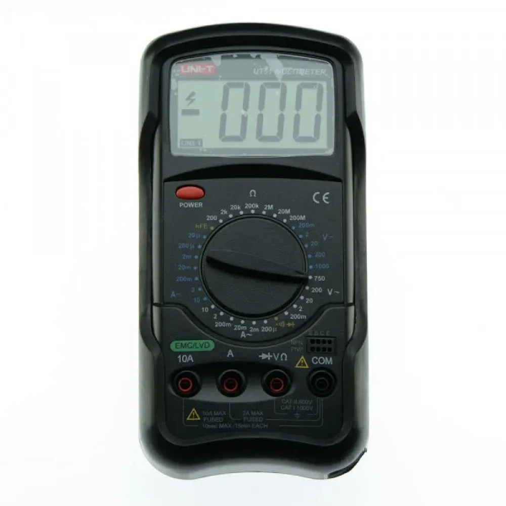 Характеристики Экран 1999-разрядный ЖК, 33 × 65 мм Питание 9 В батарея (6F22) Габариты 190 × 88 × 34 мм Вес 560 г Измерения Постоянное напряжение (DC) 200 мВ / 2 В / 20 В / 200 В / 1000 В; ±(0,5%+1) Переменное напряжение (AC) 200 мВ / 2 В / 20 В / 200 В / 750 В; ±(0,8%+3) Постоянный ток (DC) 20 мкА / 2 мА / 200 мА / 20А; ±(0,8%+1) Переменный ток (AC) 200 мкА / 2 мА / 20 мА / 200 мА / 20А; ±(1%+3) Сопротивление 200 Ом / 2 кОм / 20 кОм / 200 кОм / 2 МОм / 20МОм /200 МОм; ±(0,8%+1) Специальные функции Выбор диапазона Ручной Прозвонка цепи (со звуковым сигналом) + Тестирование диодов + Тестирование транзисторов + Индикация низкого заряда батареи + Автоотключение («спящий» режим) +Комплект поставки мультиметра UT51: