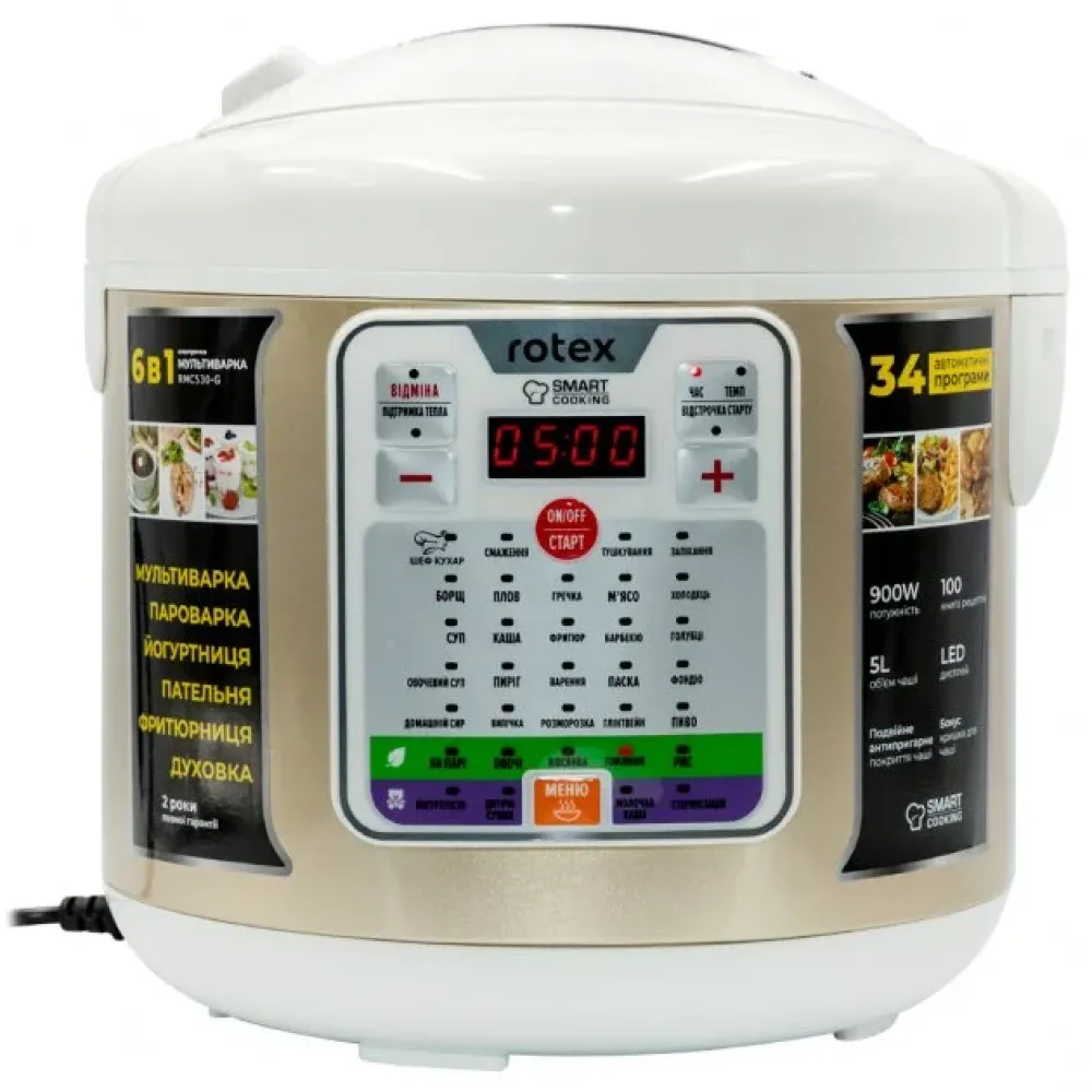 Rotex RMC530-G — многофункциональная мультиварка с набором функций Smart Cooking, а именно: регулирование времени и температуры, режим Stand by, управление функцией автоподогрева, отсрочка старта.