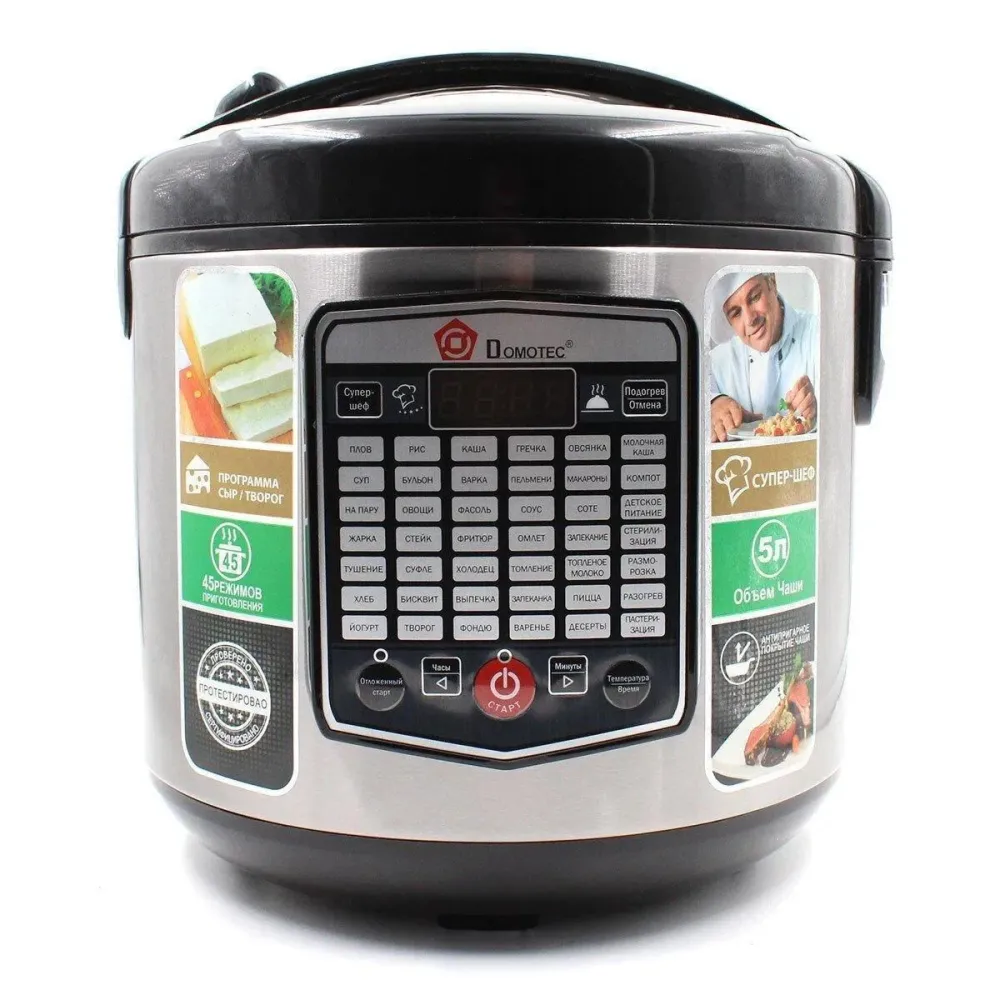 Выбирая такую мультиварку, как DOMOTEC MS-7725 с фритюрницей, вы никогда не пожалеете об этом. Она надежна и проста в управлении, укомплектована чашей объемом на 5 литров. Ее мощность составляет 900 Вт, имеется 45 режимов приготовления, включая фритюр, тушение, жарку, выпечку и даже йогурт. Предусмотренный дисплей дает возможность не только контролировать процесс, но и воспользоваться отсрочкой старта до 24 часов. А дополняет данную модель все необходимые аксессуары и стильный дизайн, который позволит ей хорошо смотреться на любой кухне, занимая минимум места.