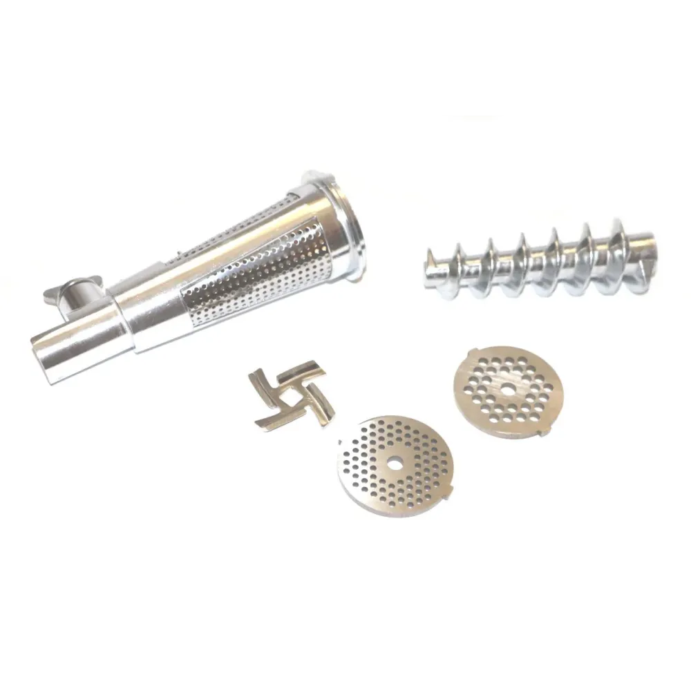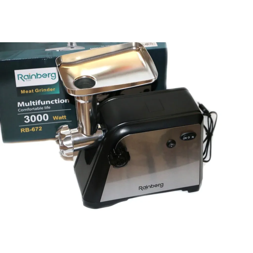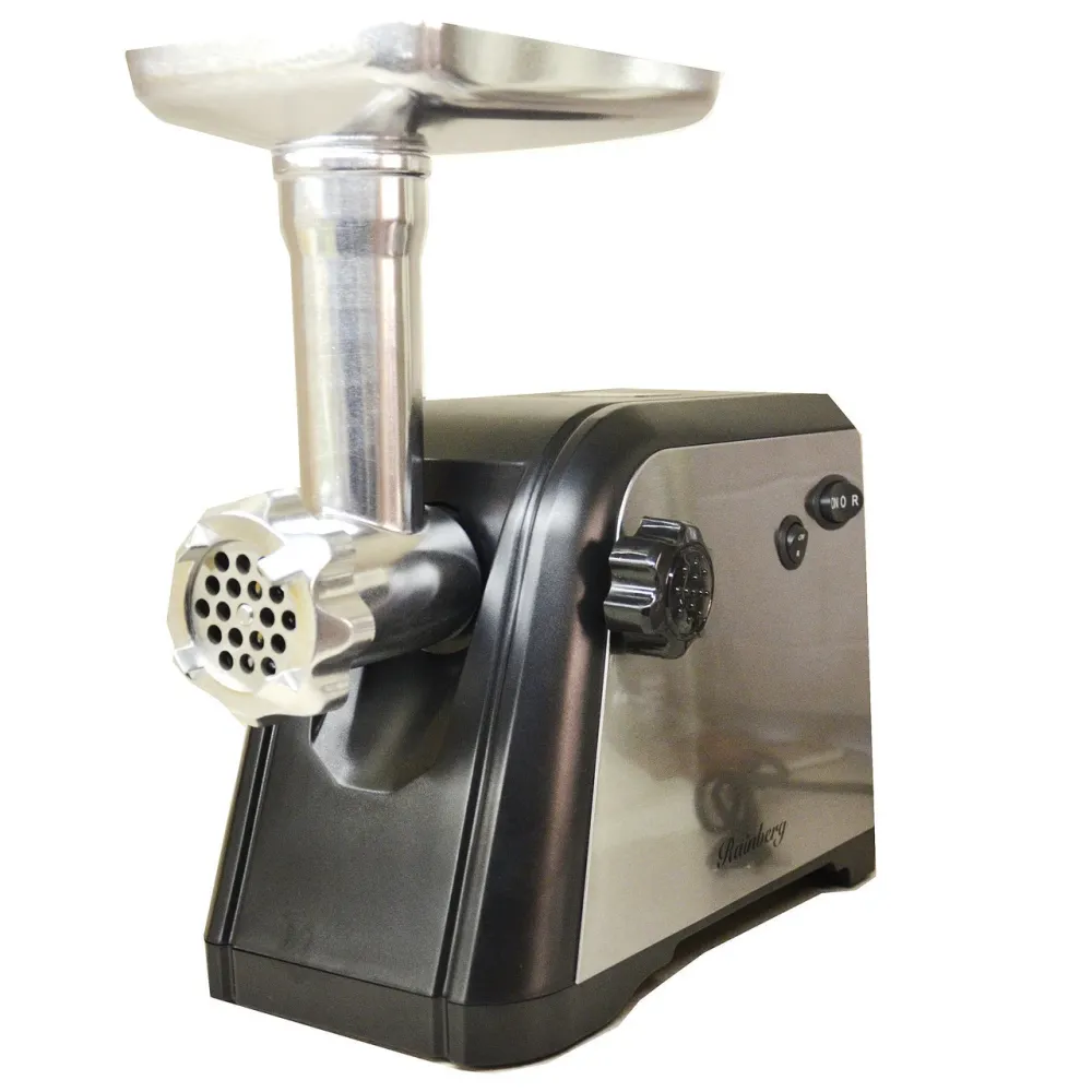 Универсальное устройство, которое сэкономит время и силы любой хозяйке электрическая мясорубка Rainberg Мощность 3000 Вт способна перемолоть мясо, рыбу, овощи, сделать любую нарезку, профилирования песочного и пельменного теста. А так же приготовит сок или морс для консервации. Тип мясорубки — шнековый. Данная модель снабжена функцией "реверс": для предотвращения уплотнения продуктов внутри мясорубки предусмотрен режим обратного вращения шнека. Корпус мясорубки изготовлен из прочного пластика, на нижней части корпуса расположены прорезиненные ножки для дополнительной устойчивости. Мощность двигателя 3000 Вт. 2 острых ножа из нержавеющей стали. Головка корпуса из алюминия. Набор решёток для приготовления фарша. Низкий уровень шума. Крестоподобный нож из нержавеющей стали.