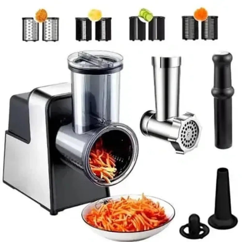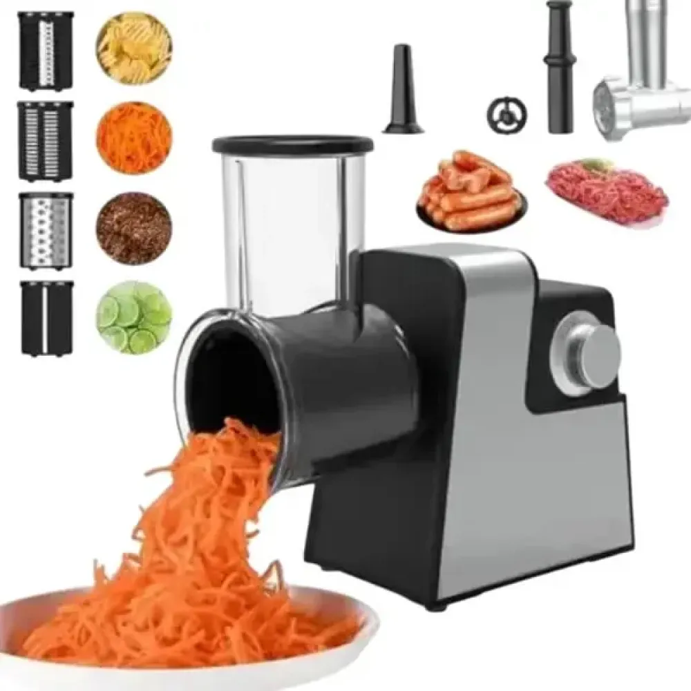 В комплект входят 7 насадок, которые позволяют измельчать, фаршировать, шинковать и тереть продукты, а также овощерезка для быстрого приготовления салатов и закусок. Компактный корпус и удобная ручка обеспечивают комфортное использование.
