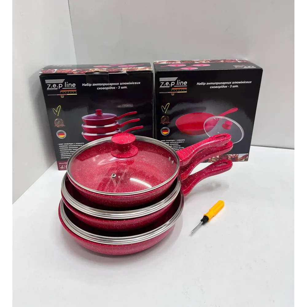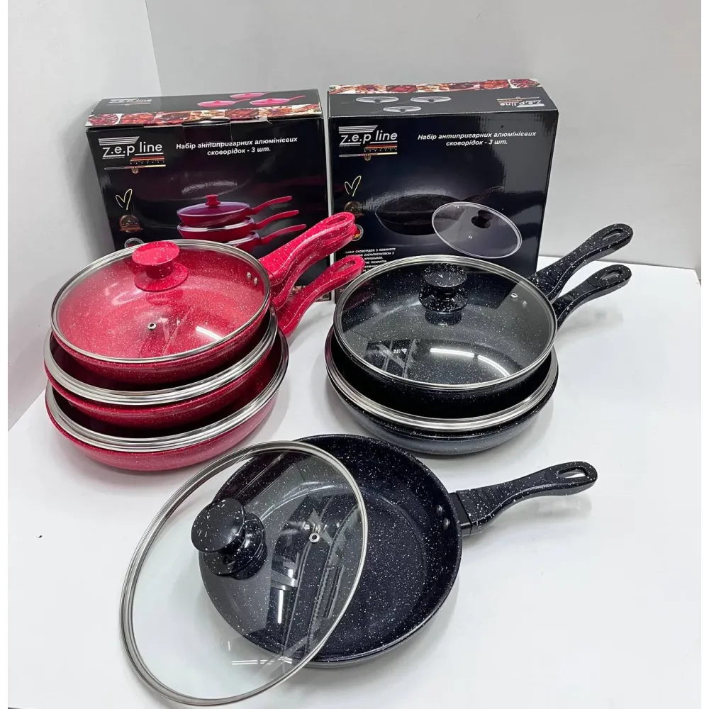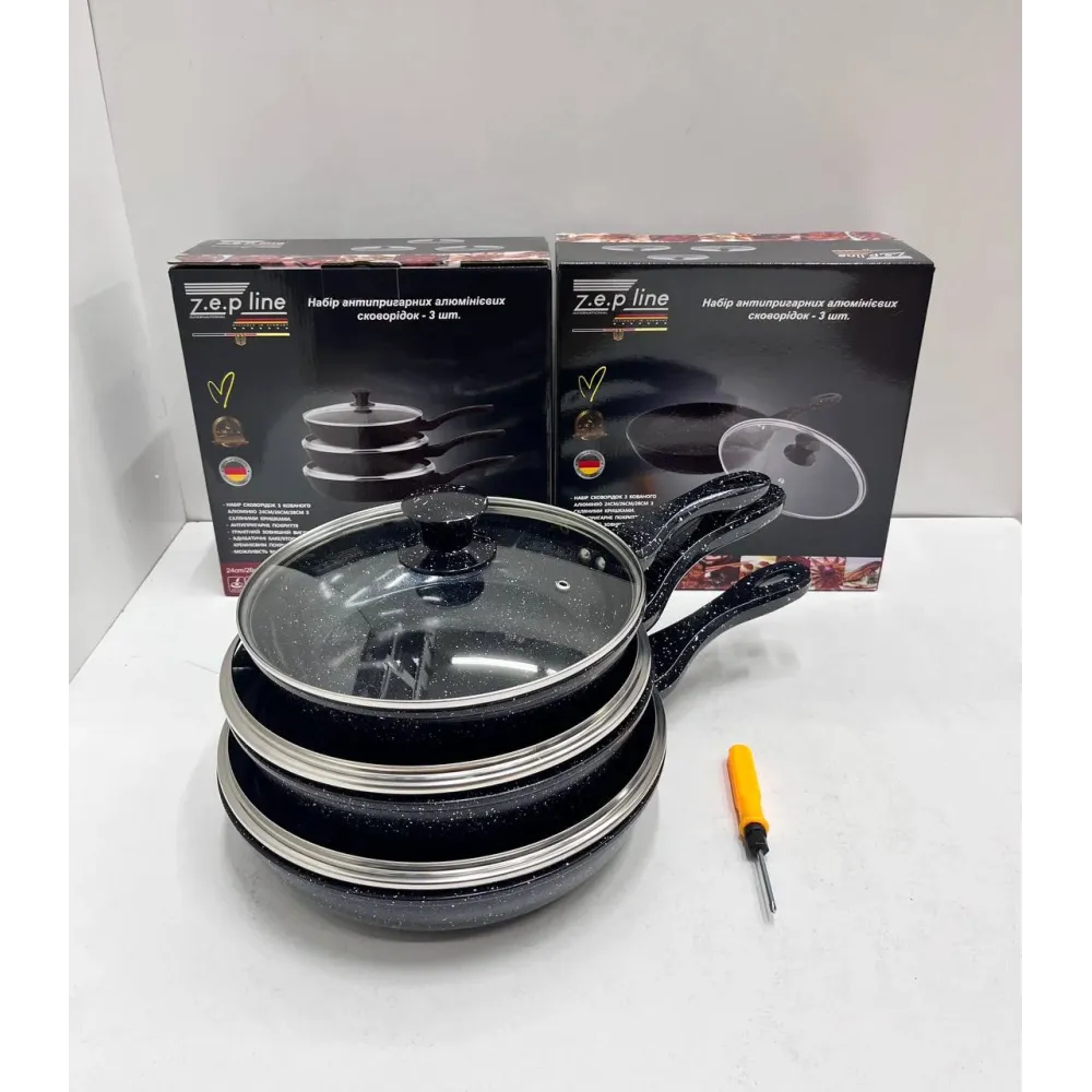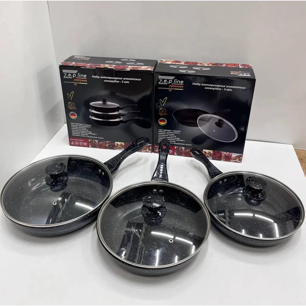 Набор алюминиевых сковородок с антипригарным покрытием и стеклянными крышками Zepline ZP-700 (3 шт)