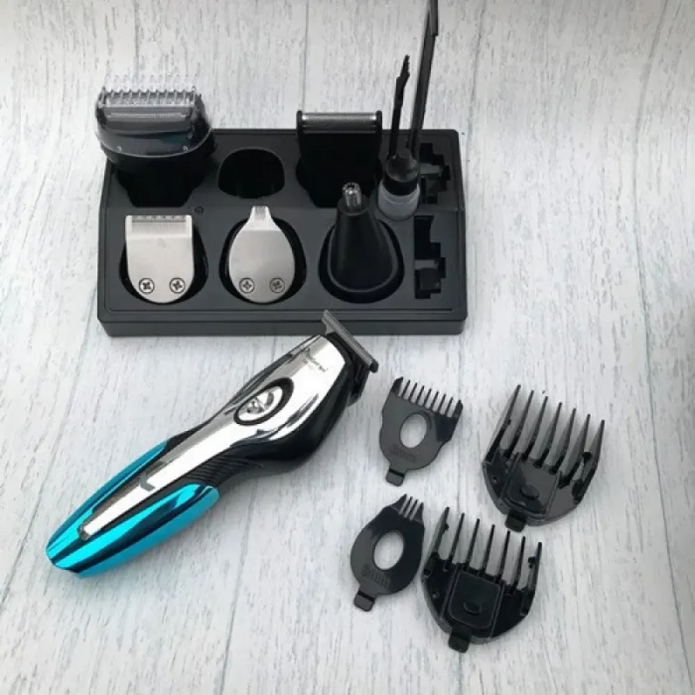 Машинка для стрижки укомплектована сменными насадками: бритвенная, для носа и ушей, для регулировки длины.