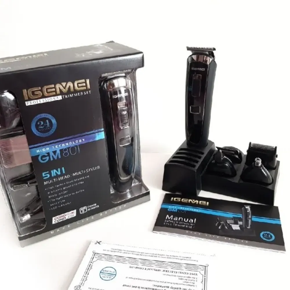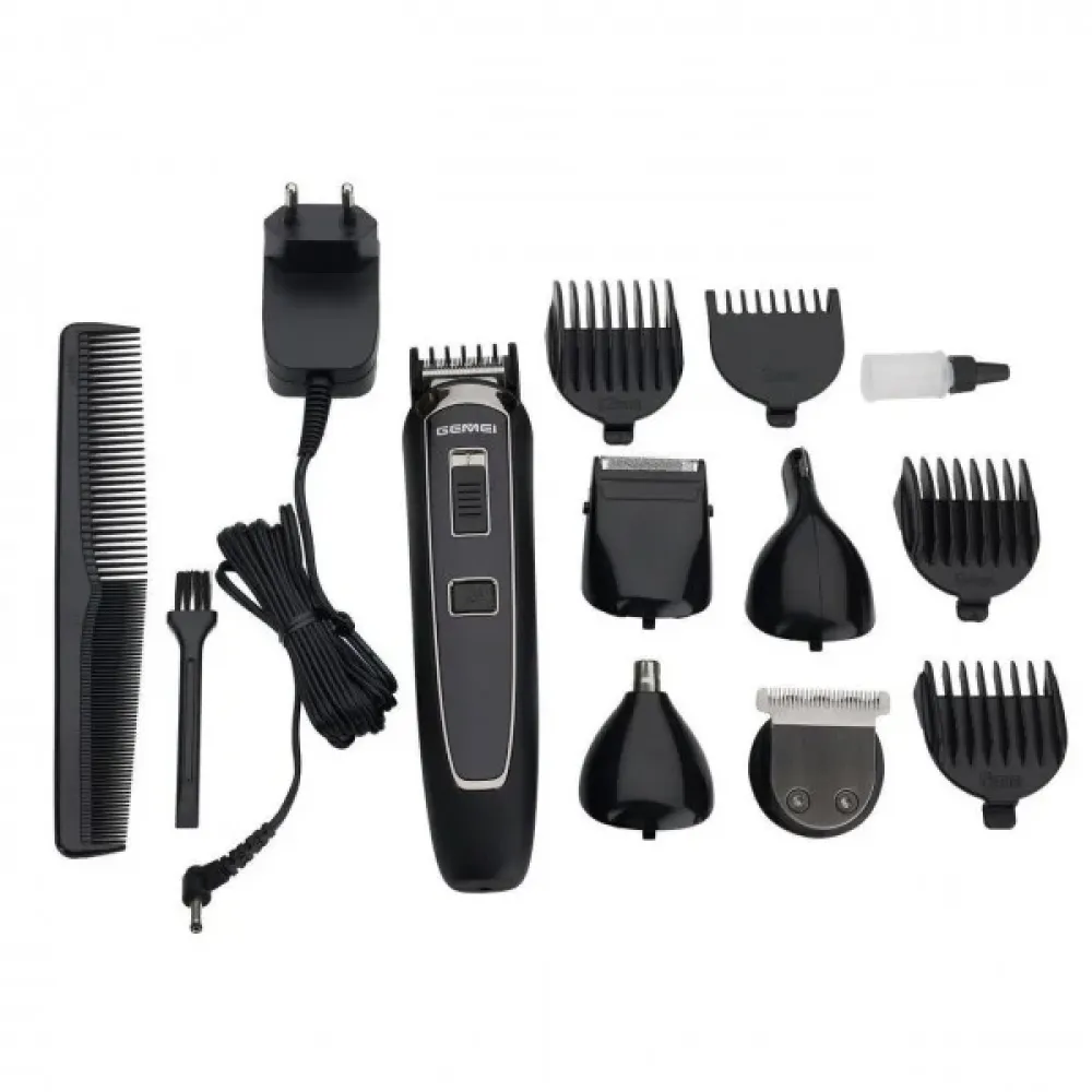 Набор для стрижки универсальный Триммер машинка для стрижки 5 в 1 Gemei GM801 – триммер аккумуляторного типа, который работает без проводов. Нужно лишь перед процедурой зарядить триммер специальным зарядным устройством. Gemei GM-801 может работать в бесперебойном режиме более сорока минут.