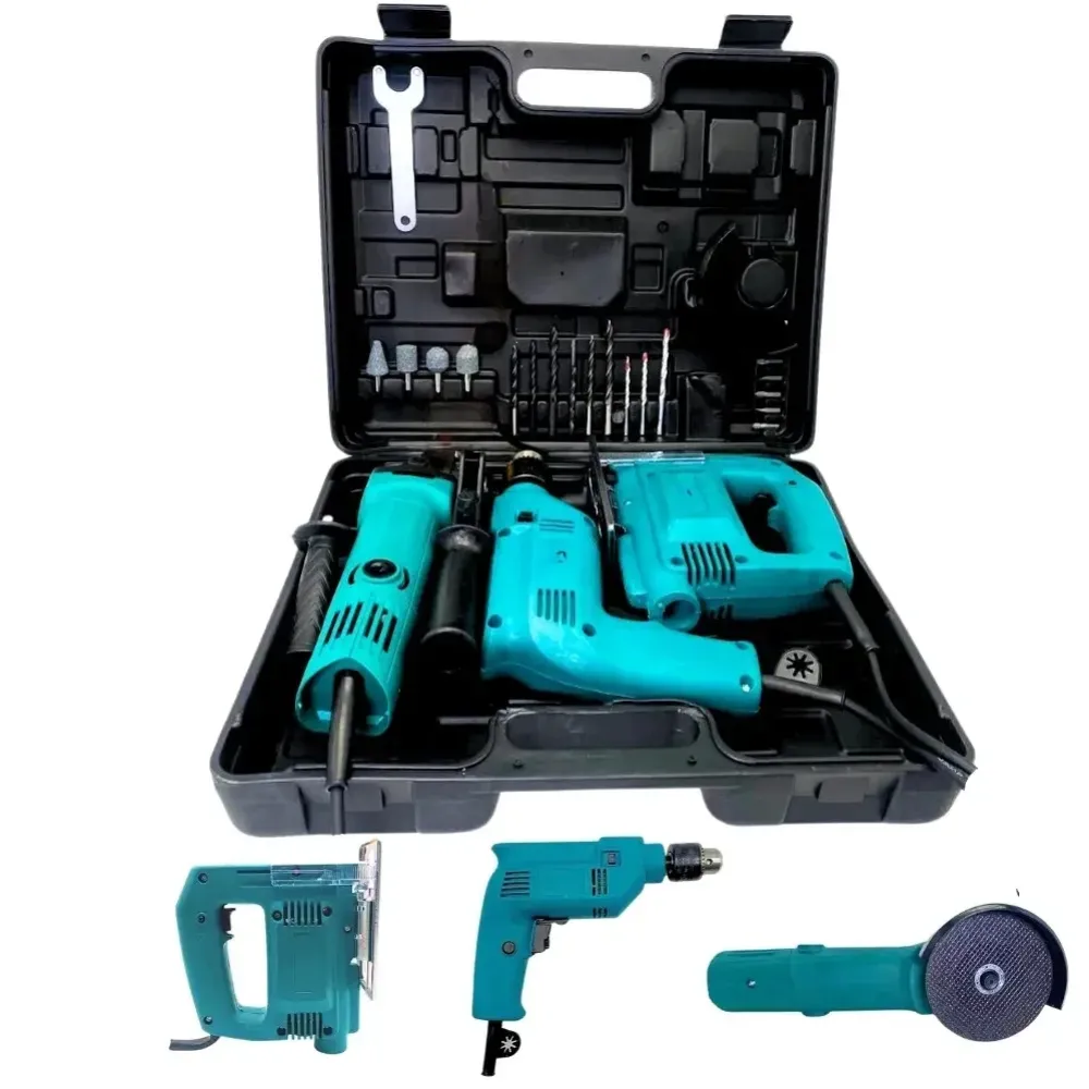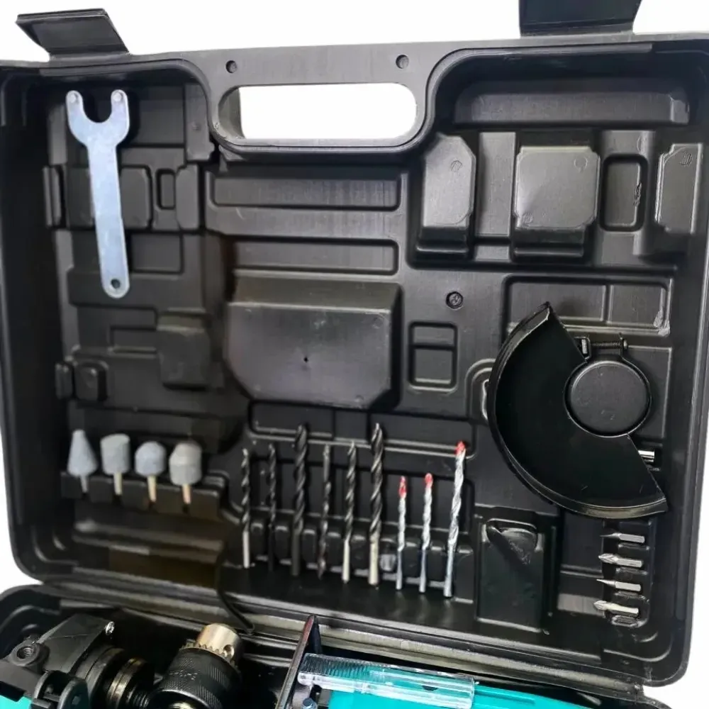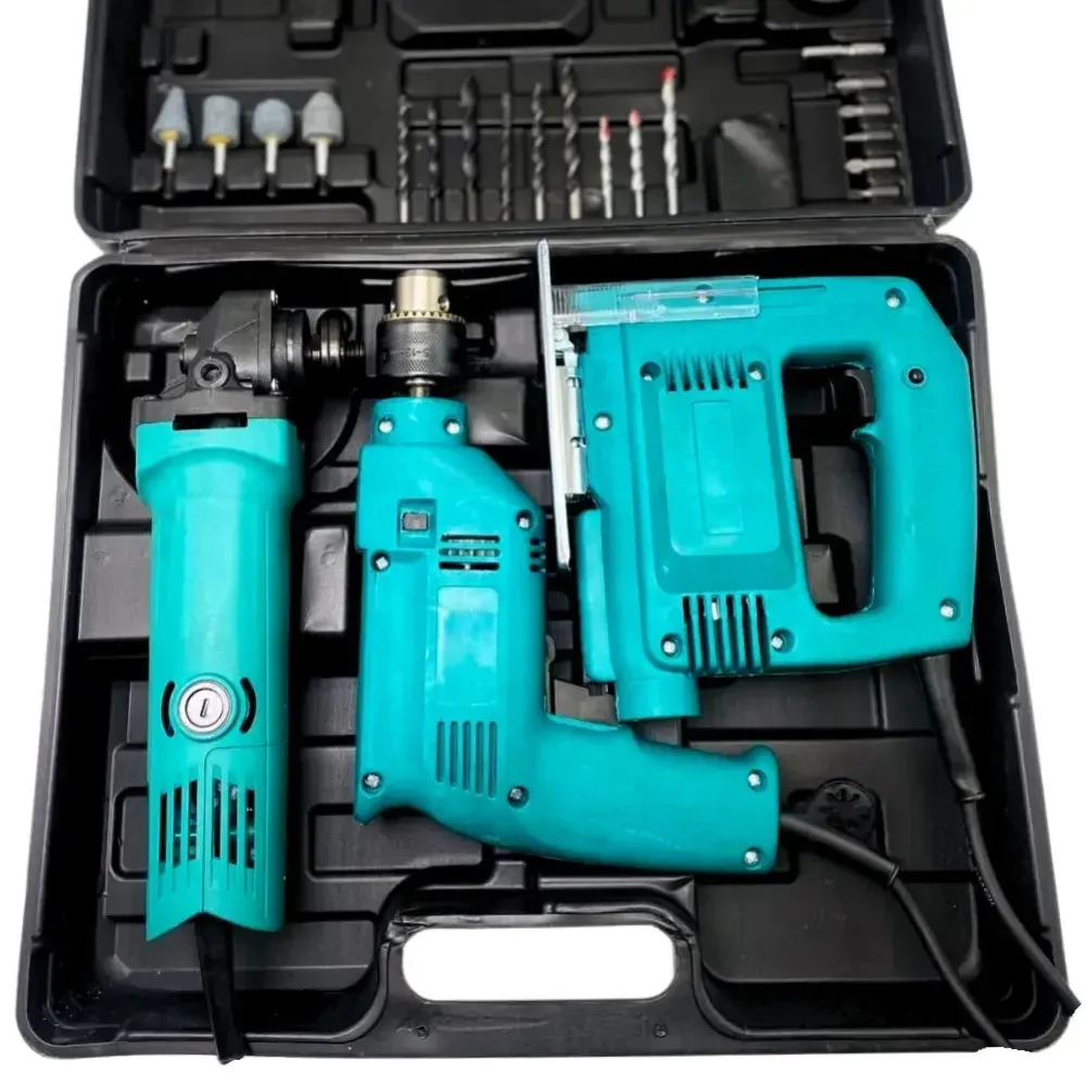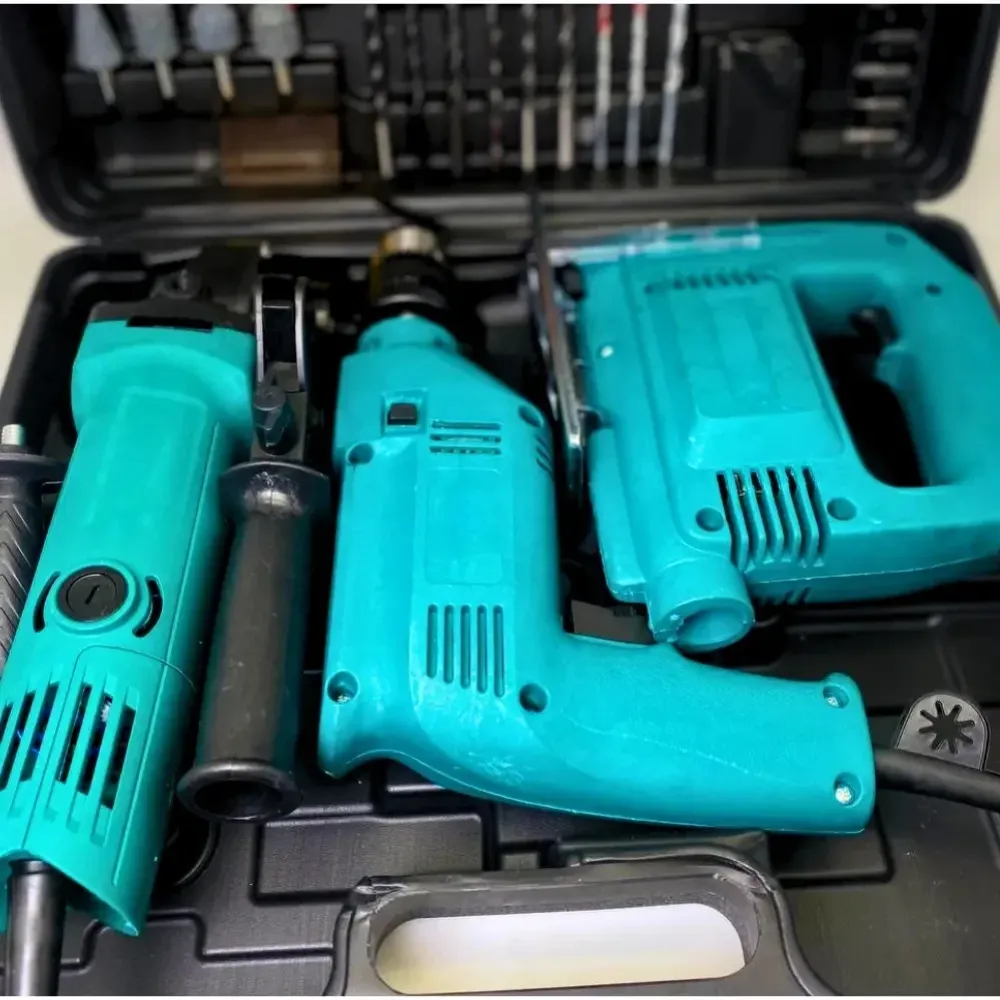 Универсальный набор электроинструментов 3 в 1 — это незаменимое решение для каждого дома, гаража или дачи. В прочном пластиковом кейсе вы найдёте три основных электроинструмента: ударную дрель, лобзик и болгарку, а также всё необходимое для начала работы — насадки, рукоятки, защитные элементы и ключ. С этим комплектом вы легко выполните сверление, распил, шлифовку и сборку конструкций без привлечения специалистов.