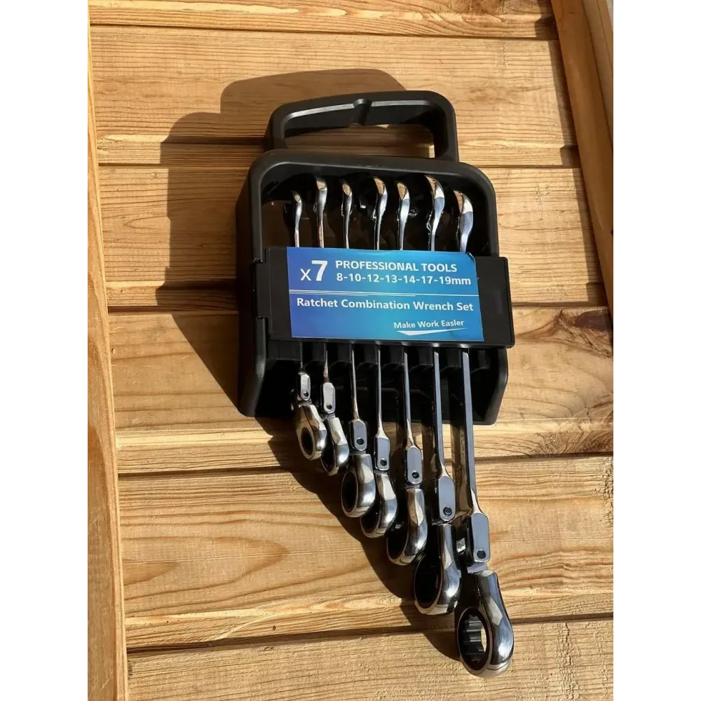 Ключи комбинированные трещоточные шарнирные в наборе 7 шт. Wrench set ES-7 – это идеальный инструмент для любой мастерской или домашнего использования. Они удобно расположены в подвеске, что обеспечивает легкий доступ и предотвращает потерю ключей. Специальный наконечник позволяет откручивать винты даже с поврежденной (круглой) головкой, что делает эти ключи незаменимыми в самых сложных ситуациях. Прочный рельсовый механизм из закаленной стали обеспечивает надежность и долговечность, позволяя работать с минимальным усилием.