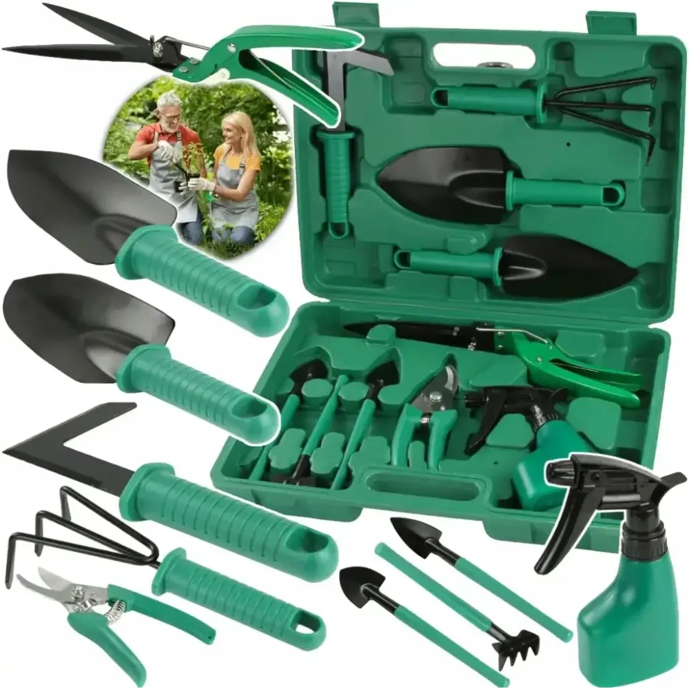 Каждый инструмент оснащён эргономичной ручкой, обеспечивающей комфорт при длительной работе. В комплект входят лопатки, грабли, скребок, секаторы и даже опрыскиватель — вы сможете выполнять все основные задачи, от посадки и прополки до обрезки кустов и ухода за клумбами.