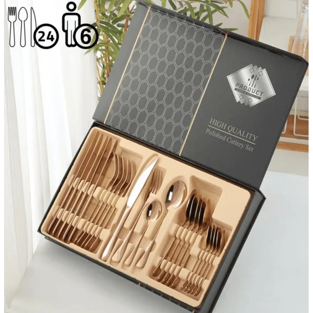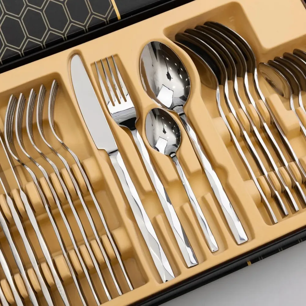 Стильный и качественный столовый набор из 24 предметов на 6 персон в классическом дизайне без лишних деталей станет отличным дополнением вашего стола. Набор изготовлен из высококачественной нержавеющей стали (Stainless Steel 410), устойчивой к ржавчине и износу, что обеспечивает долгий срок эксплуатации.