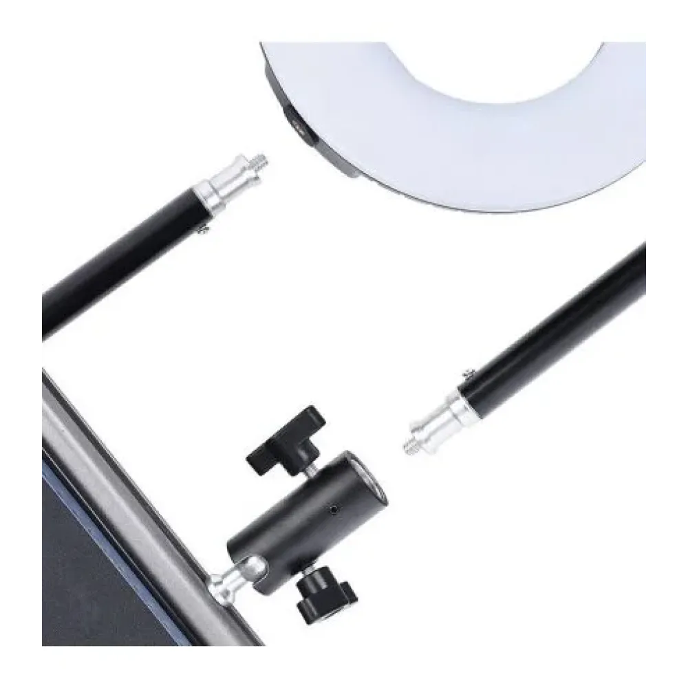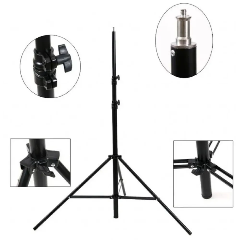 Напольный штатив тринога для кольцевой лампы · Стойка тринога для видеокамеры, фотоаппарата максимальной высотой 2,1 м идеально подойдёт для всех типов кольцевых ламп, а также предназначена для установки студийных и накамерных вспышек. Вес стойки позволяет надежно удерживать практически все студийные вспышки, вес которых не превышает 2кг.
