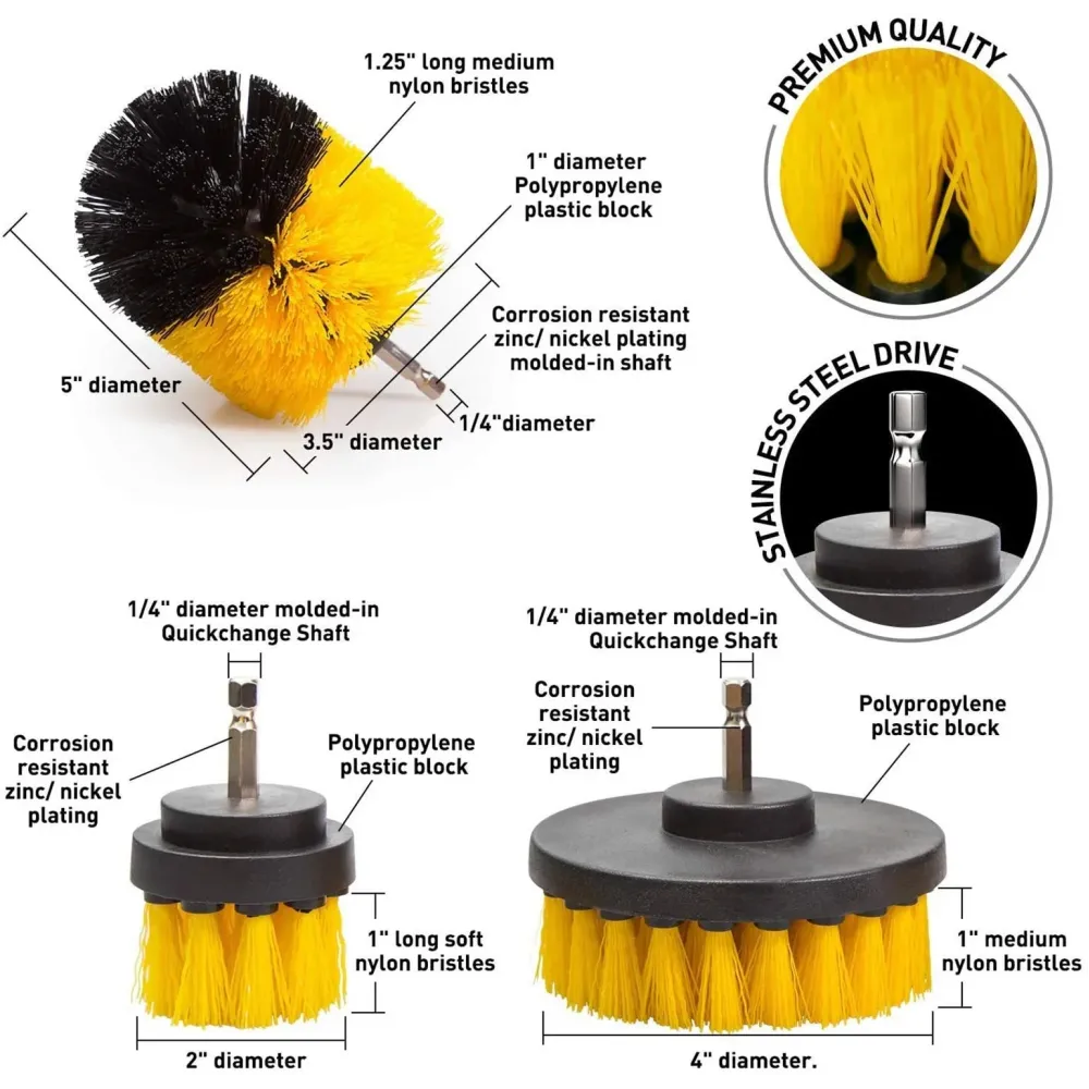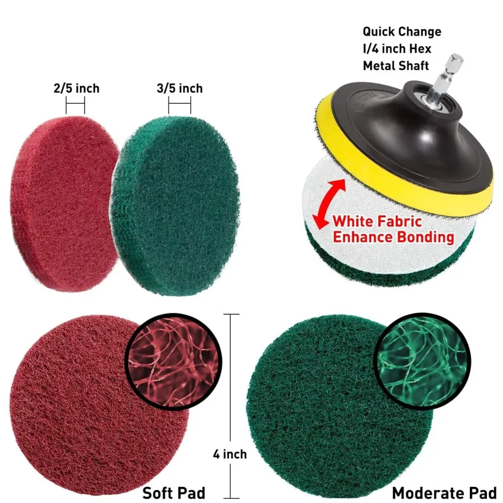 - Комплектация: 3 щетки (Ø 2", 3.5", 4") + 4 абразивные губки (2 красные, 2 зелёные) + 1 крепление под пад