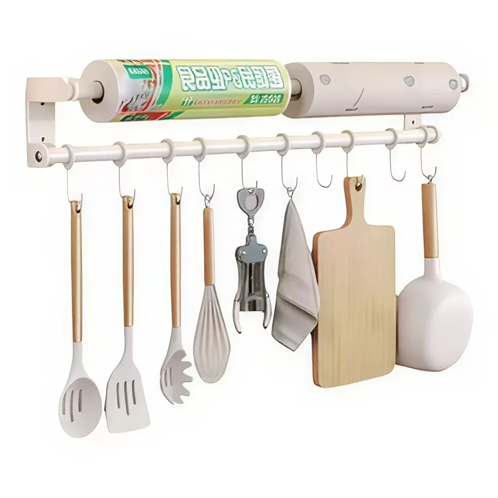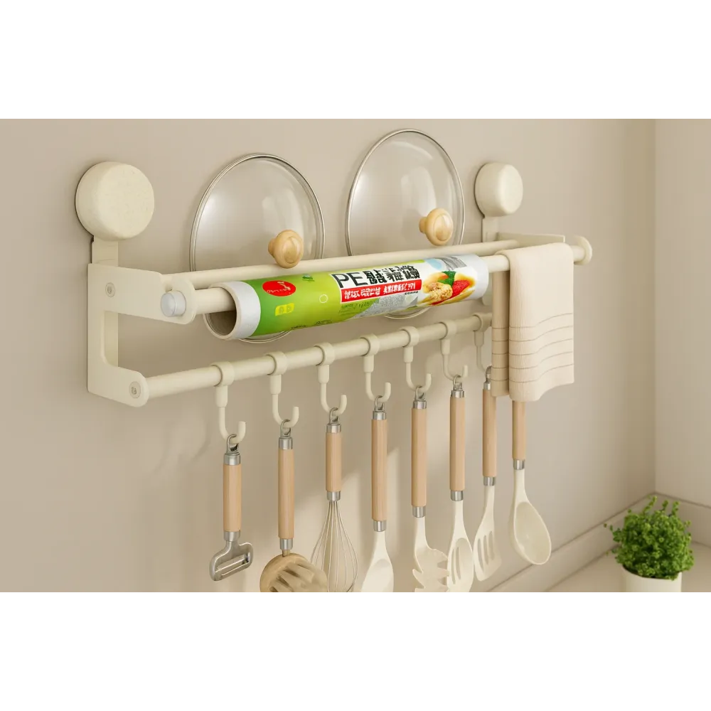 Крючок оснащён несколькими вешалками и полкой, что позволяет одновременно размещать кухонные приборы, полотенца, кружки, кастрюли и сковородки. Прочная конструкция выдерживает ежедневное использование и долговечна. Настенный монтаж обеспечивает удобный доступ и помогает экономить место на кухне.
