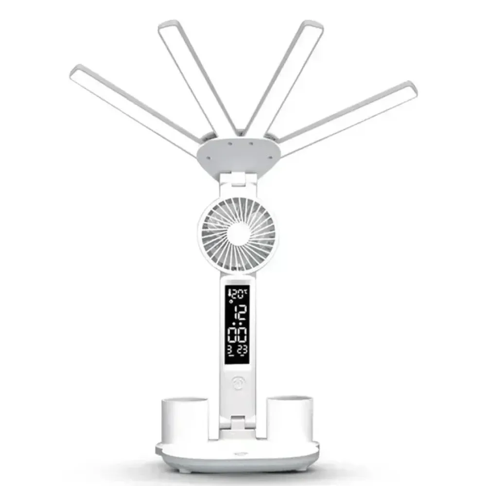 Настольная LED-лампа KRX-1011 с вентилятором, часами и подставкой • Аккумуляторный светильник с дисплеем, сенсорным управлением и 3 режимами света для работы, учебы и дома