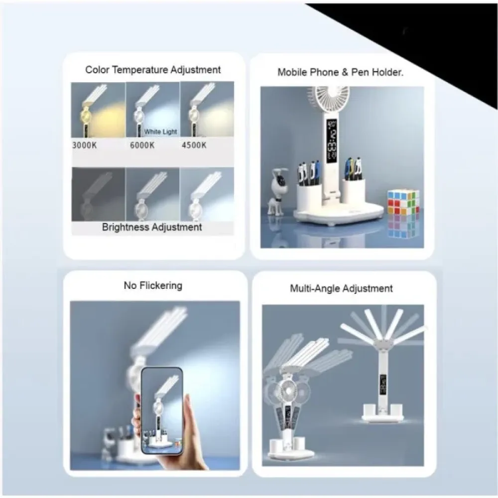 Настольная лампа KRX-1011 — это многофункциональное решение для рабочего стола, которое объединяет LED-освещение, встроенный вентилятор, электронные часы и удобную подставку для мелочей. Такая модель помогает организовать пространство аккуратнее, добавить комфорт во время работы или учебы и одновременно сократить количество отдельных аксессуаров на столе. Благодаря современному формату и полезным функциям лампа хорошо подходит для дома, офиса, учебного места школьника или студента.